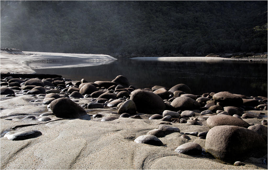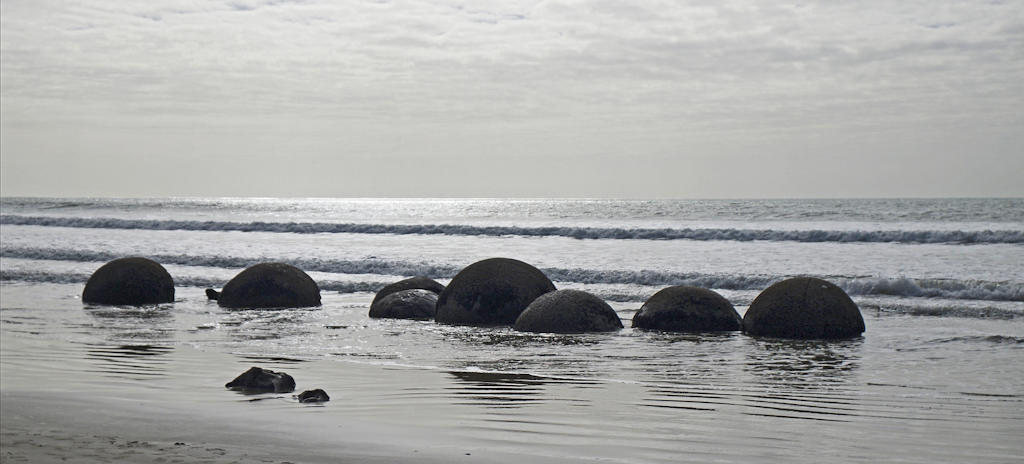 Moeraki Boulders – Honours A high impact print which is very monochromatic and is significantly abstract in essence. Excellent lighting, while the small rocks at the bottom left contributed to a vertical staircase to counteract the predominant horizontals. Would suggest you try to reduce, a little, the tonal density of the dark wave line between the boulders and horizon so that it becomes less distinct.