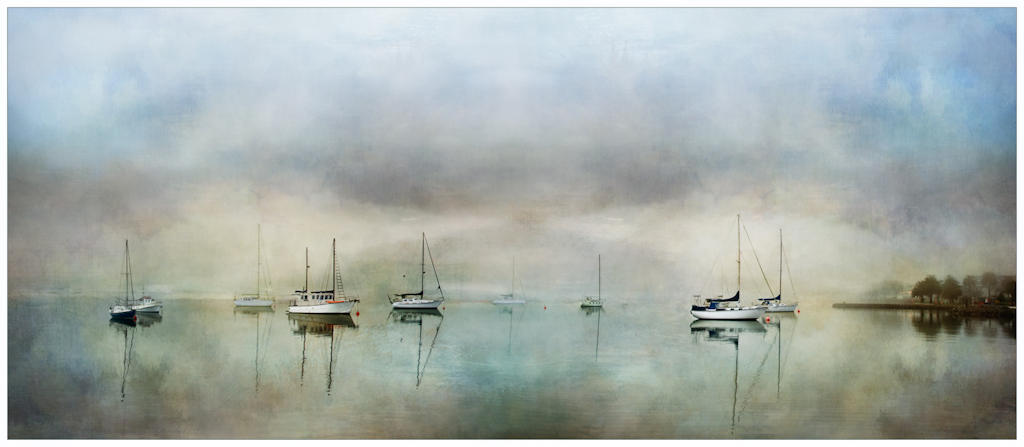 Foggy Morning in Picton – Merit The textured canvas approach has a unifying effect on the composition and provides a painterly presentation. This thin panorama format works well with the subject matter. After a leisurely journey from left to right, the small cluster of misty trees provided a very nice ending point.