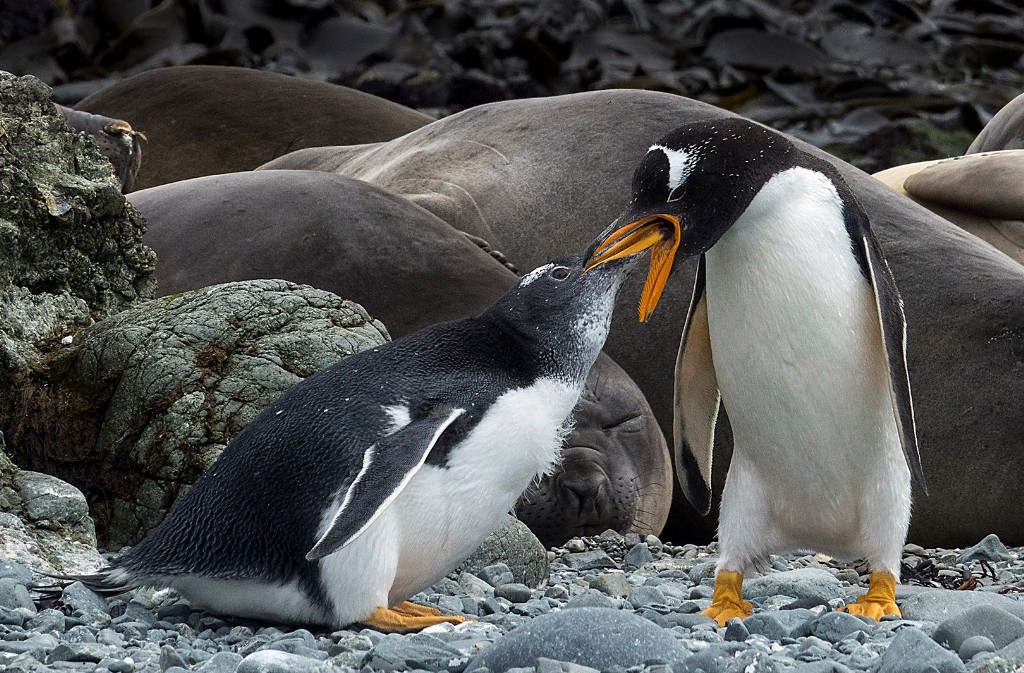 An excellent study of this Gentoo Adult and chick engaged in activity, totally unconcerned by the nearby Elephant seals
