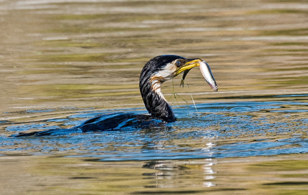 A good study of this bird doing something of interest, the vegetation in the beak possibly indicates the environment in which the fish was captured. A slight crop is the only improvement I would suggest.
