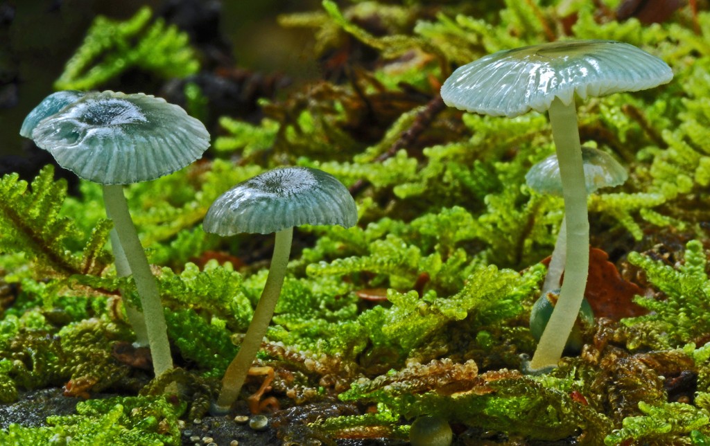 A pleasant grouping of the three fungi, which unfortunately are all at the same stage of growth. A touch of greenery in the backgrond gives some relief and texture to the background