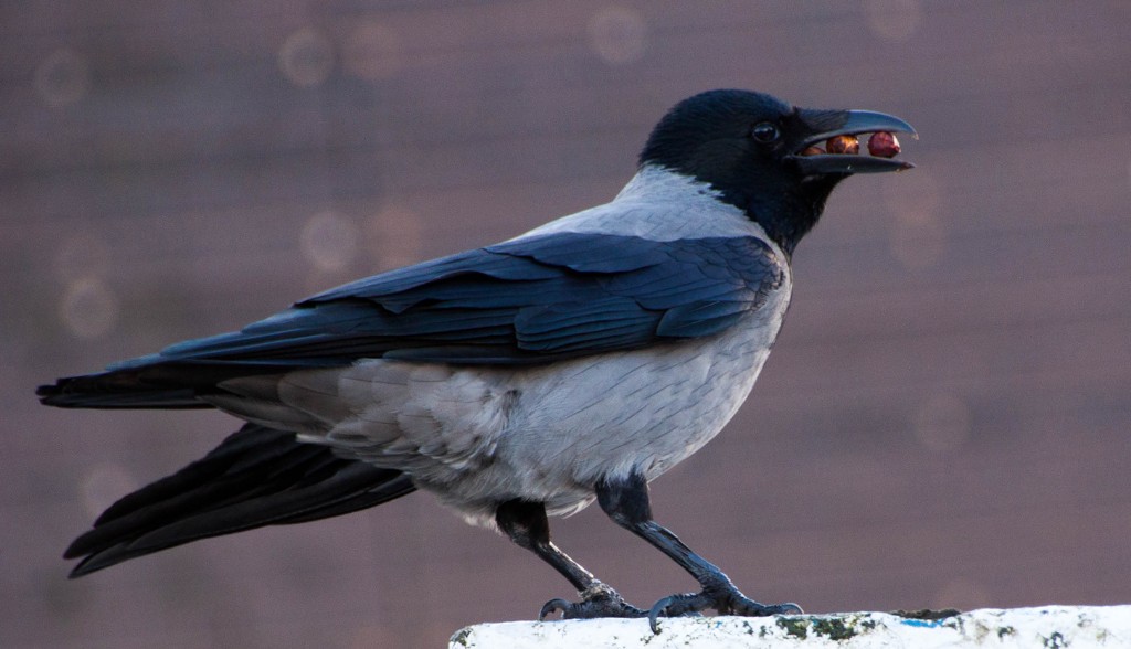 A colourful image showing this variety of the crow family as omnivorous and not just a carrion and scrap eating bird. It is a pity the platform is so insistent. The parallel lines across the background and out of focus spangles could be toned down with some afterwork.