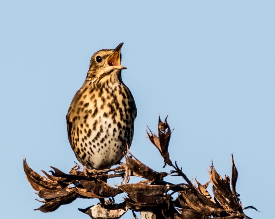 Captured in full song on the dried seed heads of Phormium tenax which are in keeping colourwise, but slightly distracting . Cropping to an vertical is an acceptable alternative