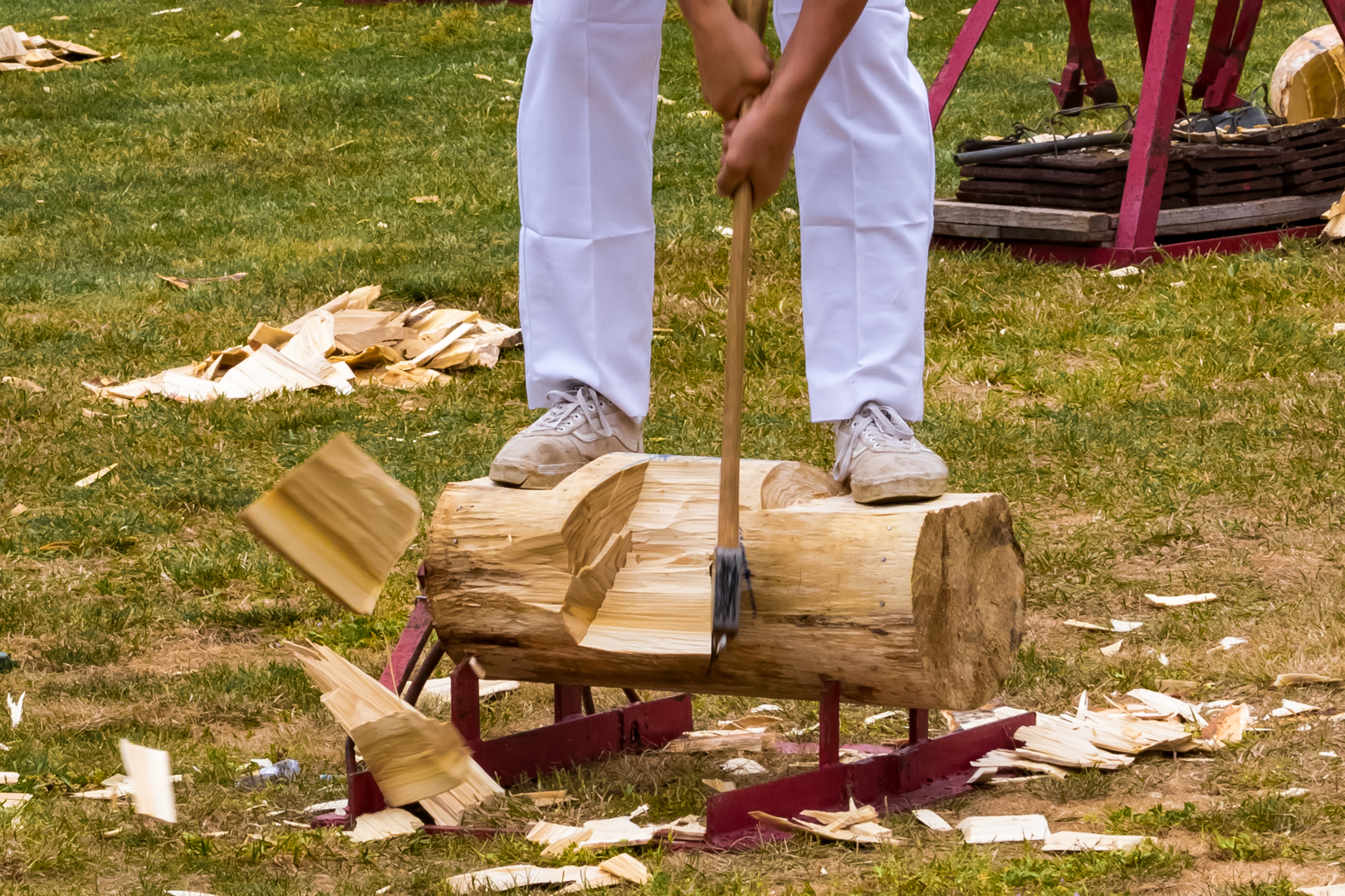 I enjoyed the large woodchips flying through the air with a little bit of blur. This gave me a strong sense of the dynamics of the sport. Shutter speed selection helps freeze the chopping action enough to see the power generated in the stroke. I liked the way the background contributes to a feel of a woodchopping competition. The placement of the horizontal line of the log along the third line gives me a strong sense of the power needed for this sport, and the vertical line of the woodsman brings the wood and the human elements together. I would have likely felt a stronger connection to the dynamics of the sport had the shutter speed selected allowed more motion blur to be an element of the image. Nicely seen and composed. |