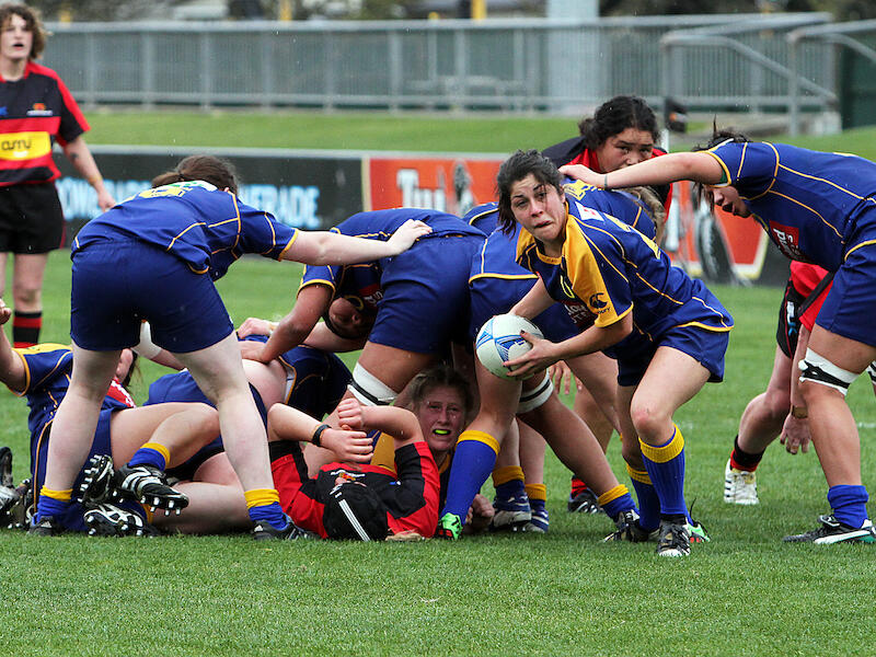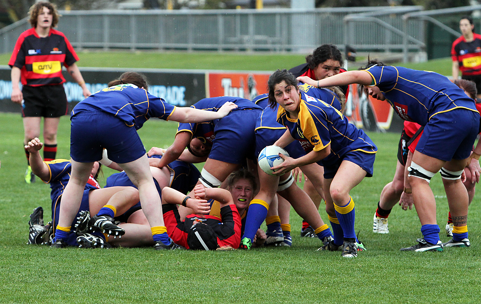 It looks like Otago v Canterbury, given the colours of the shirts and the sponsor brand on the shirts. I love the expression of both the halfback and the player trapped in the bottom of the ruck as week as the player looking toward the scrum half just on the other side of the ruck. For me these three facial expressions catch my eye and hold my attention. This allows me to really see the intensity of the halfback’s gaze on the coming passing action. Nicely composed to draw my eye to the action, and also to leave room for a pass to travel toward the camera’s direction. Nicely sharp and nicely lit where it needs to be- on the halfback and the ruck. |