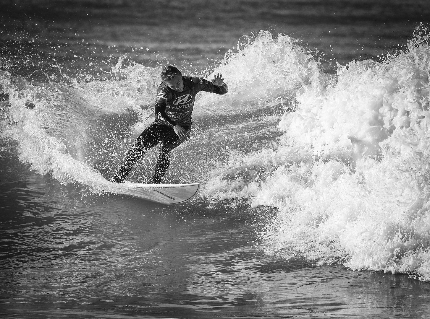 This print is outstandingly made. The composition captures the drama of the surfing action well, including the wave size, the balance and poise needed in this sport, the concentration required and some space for travel along the wave direction, implying movement. The one element in the image that nailed the connection for me in the print is the light on the surfer’s face. The printing is superb as it ensures the light is beautifully presented in every aspect of the image and makes clear the story is the surfer and not the waves. The image is beautifully sharp throughout. |