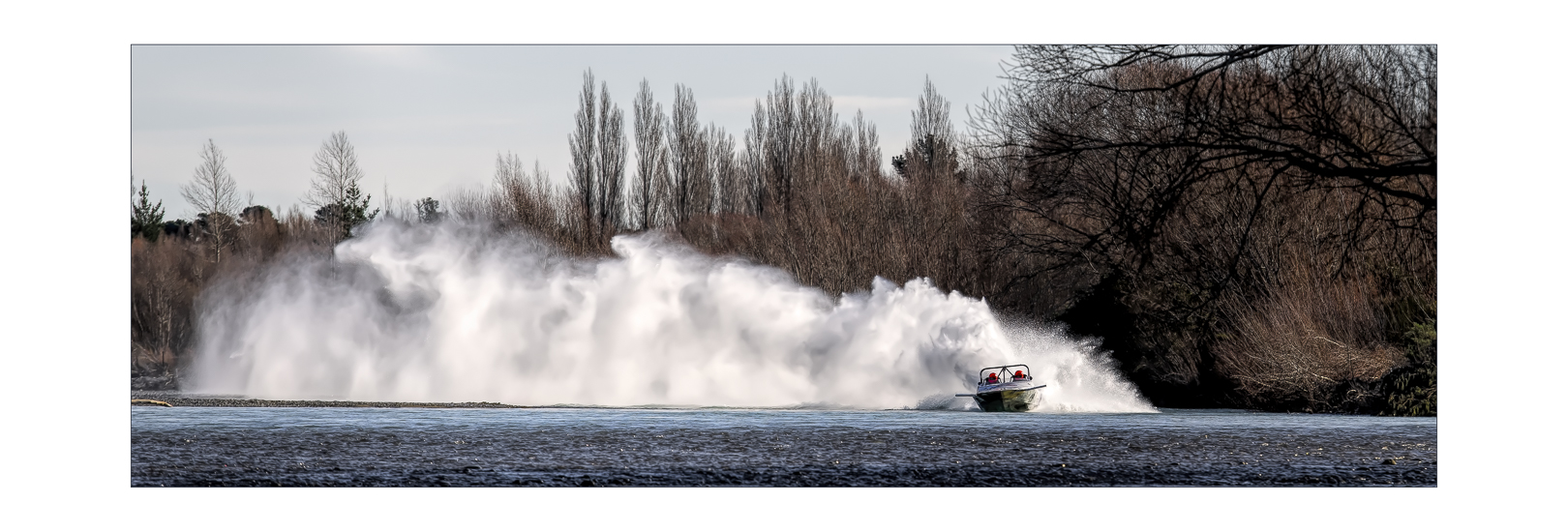 The title tells me the river’s name. In contrast the visual story doesn’t seem to care about the name of the river but does care about the excitement and action of what I think is probably jet boat racing. Quite an engaging image as it leaves space for the boat to race into, so a lot of action is implied. I like the way the background trees are used to contain my eye on the line of spray, the boat and the lines of the river. |