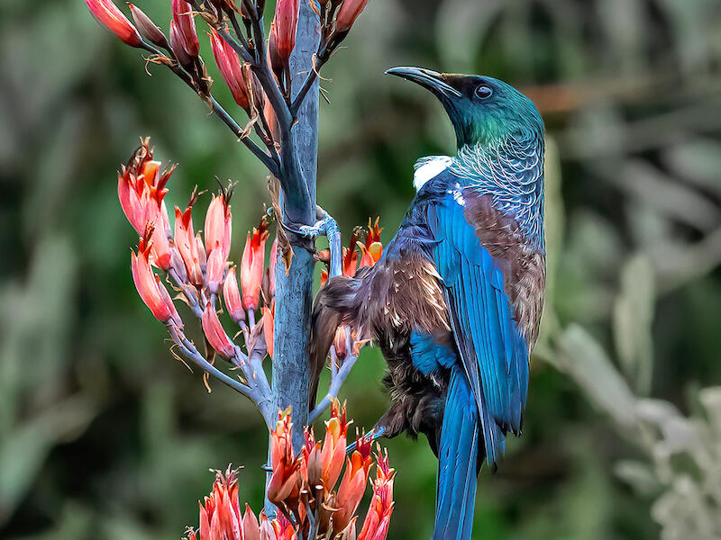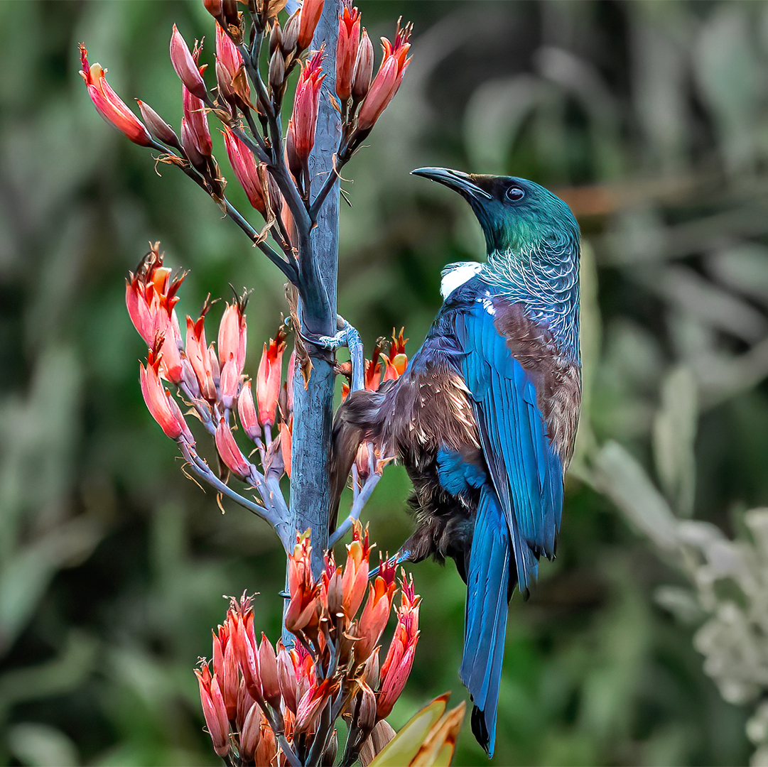 This image reminds me of my garden were there are lots of Tui’s. I find this is a beautiful image with him on the flax. Super sharp detail in the birds’ feathers and flax and the photographer has even caught a catchlight in its eye. The Tui is a national heritage animal – in Māori culture, the bird is associated with life fulfillment, confidence, and spiritual harmony. My recommendations when you photograph Tui’s try and take your exposure down one stop below normal and I find the white poie at the bird’s throat will give more detail. I might suggest a crop off the right-hand side to reduce the distractions there. Well seen and executed. |