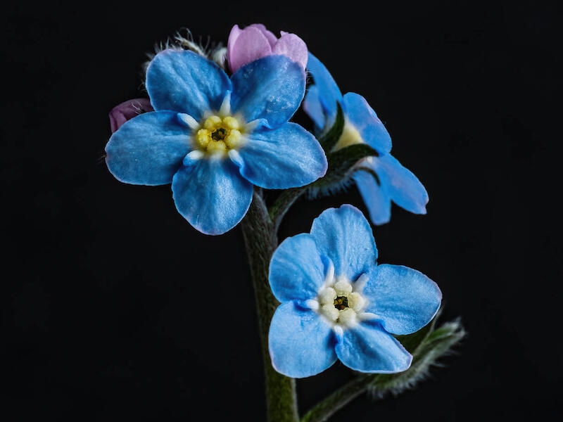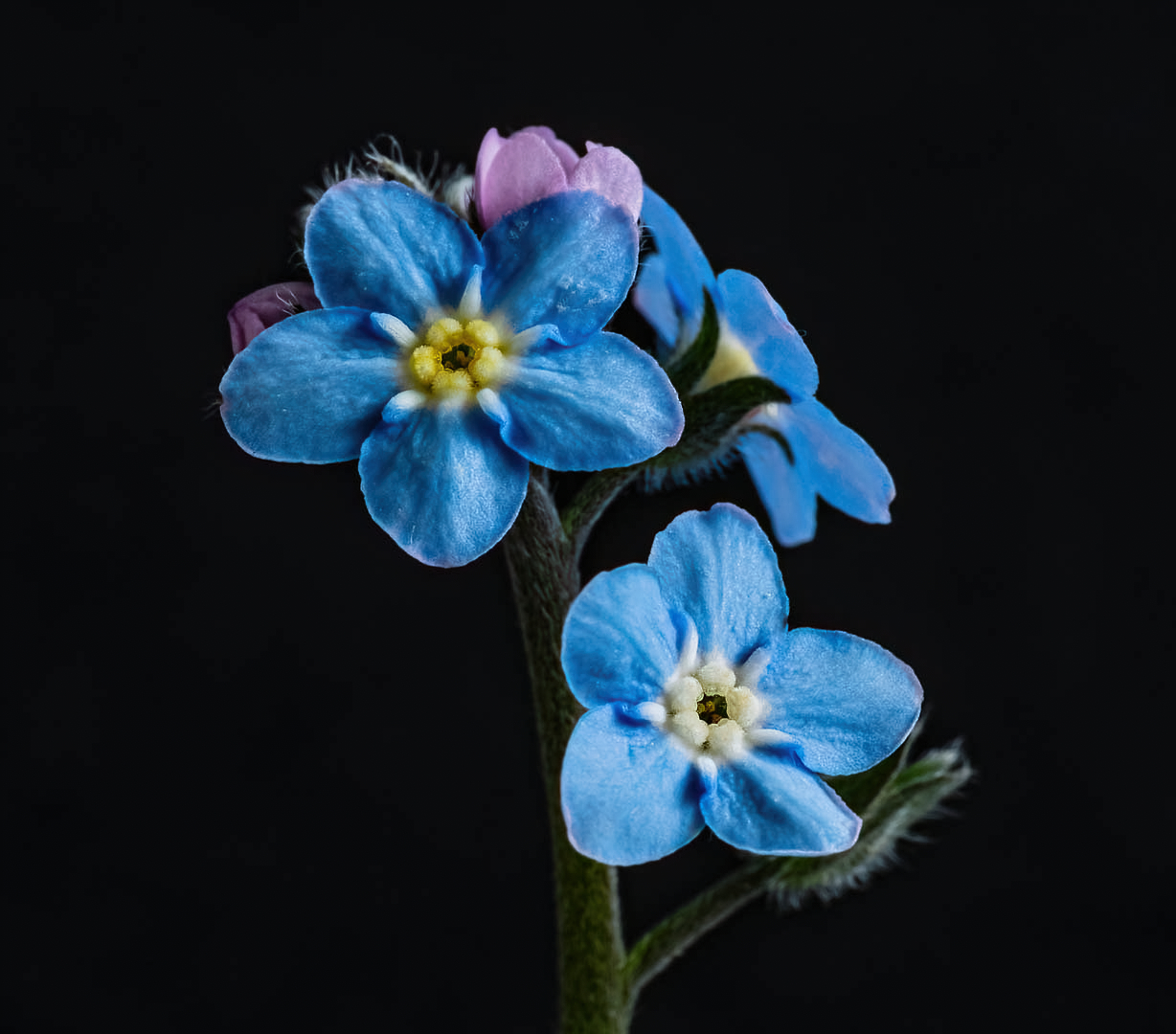 Gosh you have done well to capture such a small flower in such detail. They symbolize true love and respect; they are also considered a symbol of fidelity and faithfulness. The black background really makes them stand out. I like the combination of the complimentary colours of pink and blue. The composition shows the stem and the little bit of foliage which is called mouse’s ear as it is thought to resemble it. The image is sharp showing good colour tones and textures. The lighting has been very well handled. Congratulations |