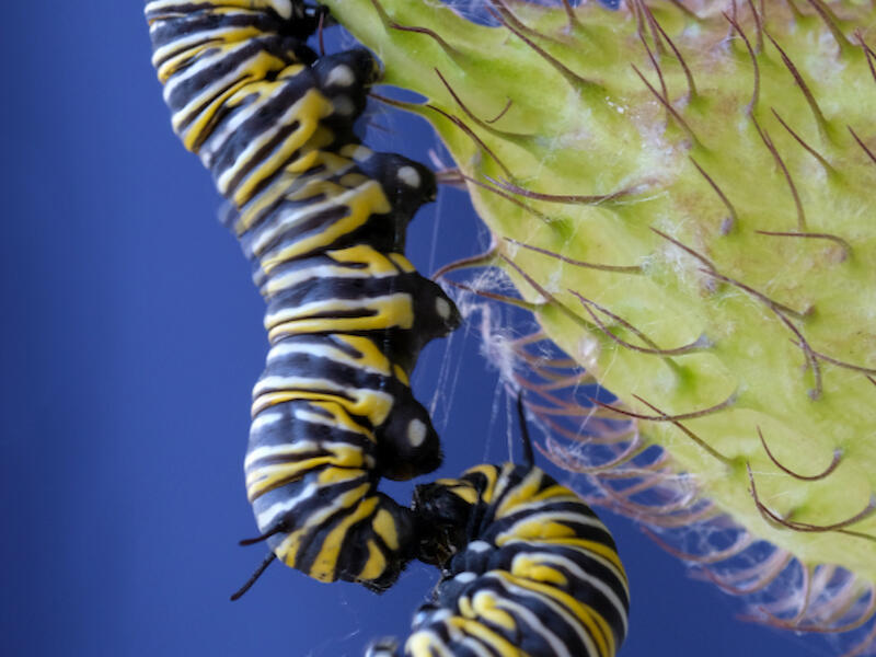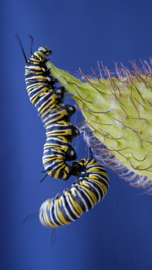 This reminds me of my hobby as I have a butterfly house and a butterfly garden dedicated to the Monarch Butterfly. I commend you for filling the frame with the seed pod and two of the caterpillars. I think the bottom one is hanging on for dear life as I can’t see him connected. The seed pod itself makes for fascinating photography especially when they break open and the seeds come out. The bodies are blurred and showing movement and I think a possible use of a faster shutter speed might have captured the head sharp on the top one. Very good effort |