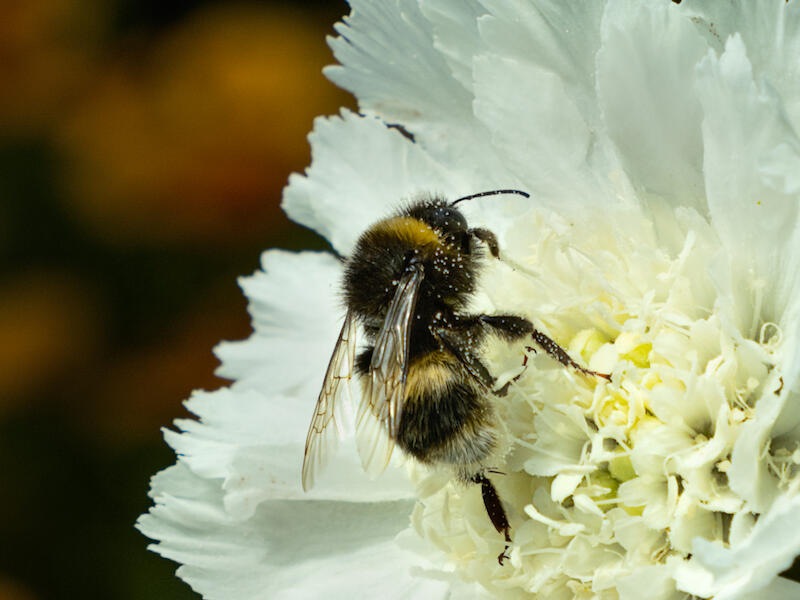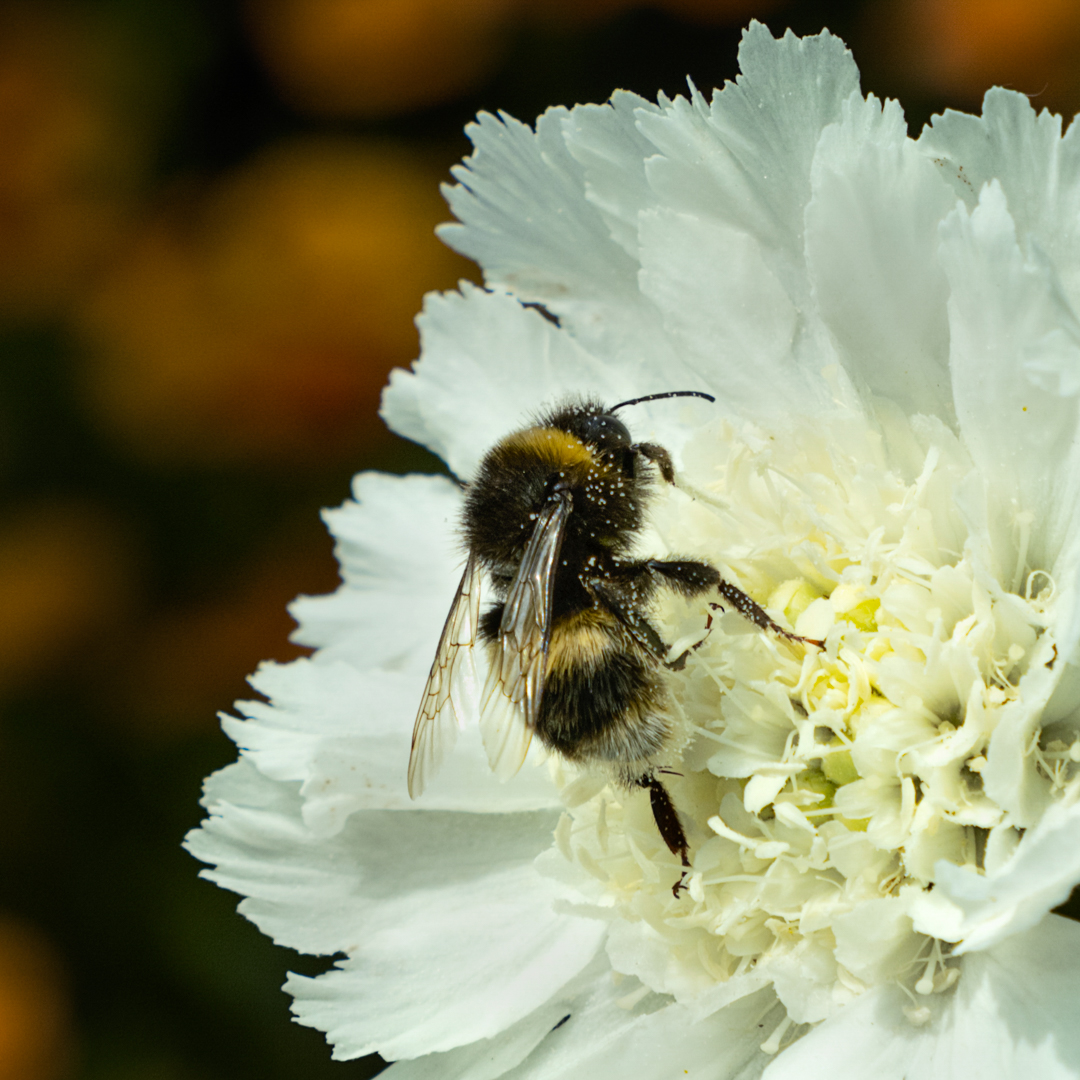 Very good macro attempt at photographing this bee and flower. Excellent composition with the flower on the right hand third with the subject being the centre of focus. I love the orange/red background which really makes the white flower pop. Your chosen depth of field has given good detail in the centre of the flower but unfortunately has given the bee a slightly soft focus. I find the lighting has caused the petals behind the bee to have lost detail and has caused some shadows to the flower. |