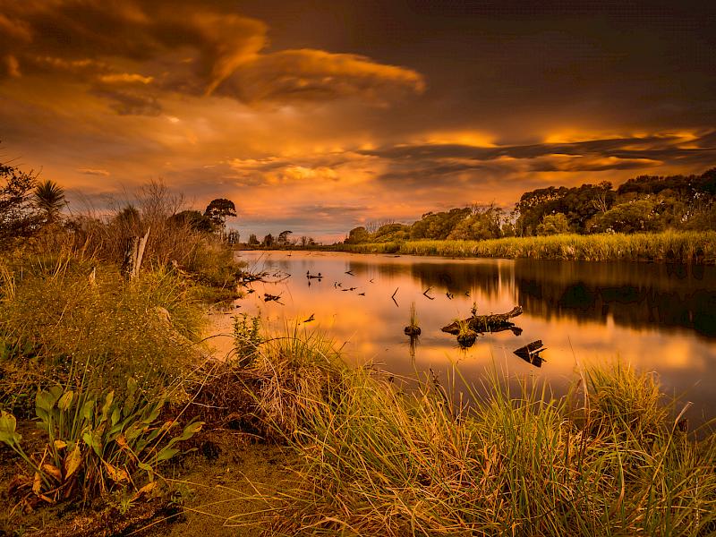 Grovetown Lagoons - Congratulations on getting up early. Well worthwhile to capture the golden hour. (might have been sunset of course!) I like how the lines lead one back to the small patch of blue in the sky. It is quite busy but I am enjoying all the intricacies.