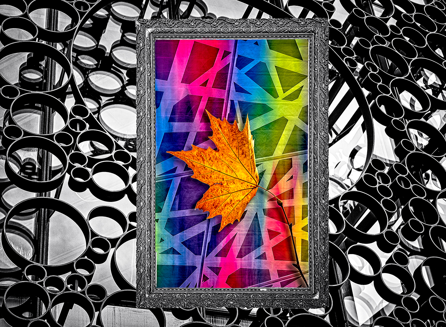Angles Lines Curves - You have put in a lot of effort here. The leaf in the centre seems a little contrived... but I agree it needed something there. Maybe a circular object to connect to the circles in the background.