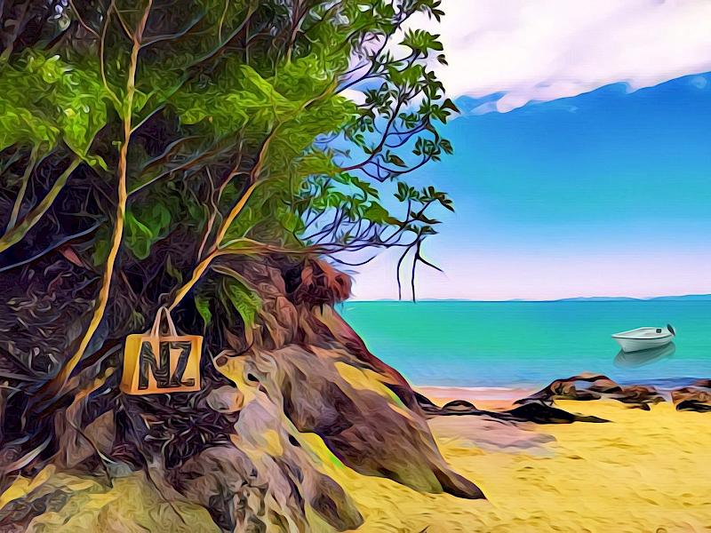 Kaiteriteri - What stunning water colour. My eye is doing a sea saw from the NZ bag to the boat…no real connection and the bag is a distraction for me. The treatment is fun and the original is probably beautiful, if there is an original.