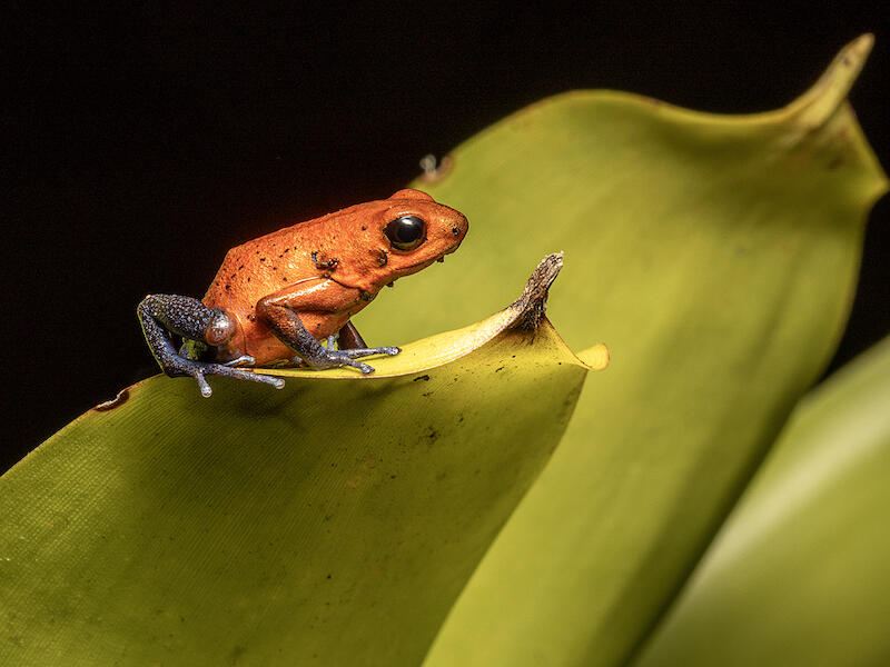 | A | Blue jean Poison Dart Frog | M | The ‘Blue Jean’ title seems obvious once you look at those dark blue legs in contrast to the bright orange body of this frog. Because of the harsh black background, I wondered if this particular frog was held in captivity or if it was situated in the wild. I enjoyed the foliage surrounding the frog, particularly the leaf it is sitting on with that damaged end. However, I felt that less is sometimes more effective and I suggest the photographer might wish to consider reframing the creature so that there was less foliage in the background. The frog is sharp and clearly quite a small creature to observe. |