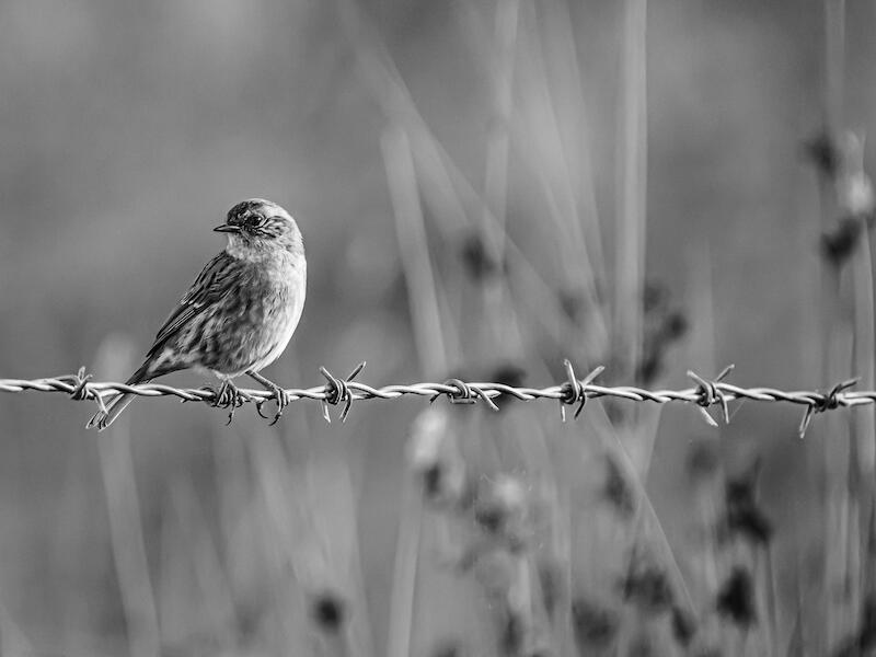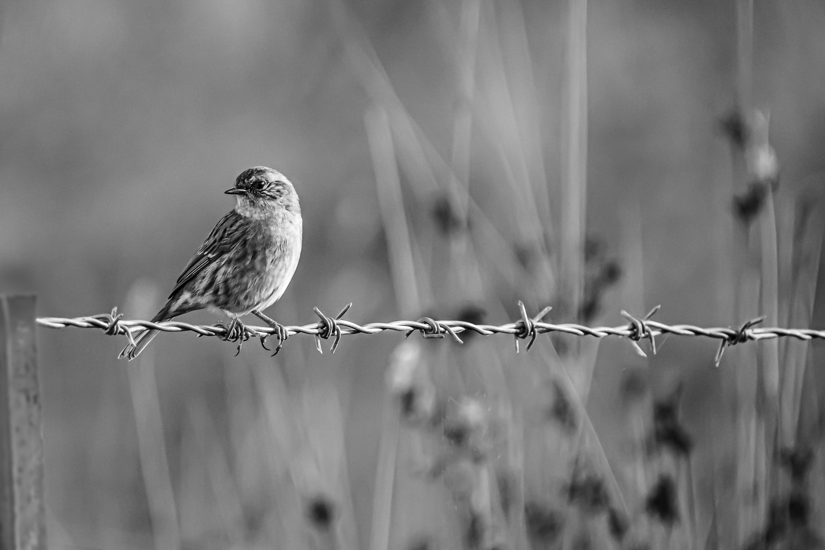 The dunnock and barbedwire stand out nicely from the blurred background. Works very well as a monochrome image.