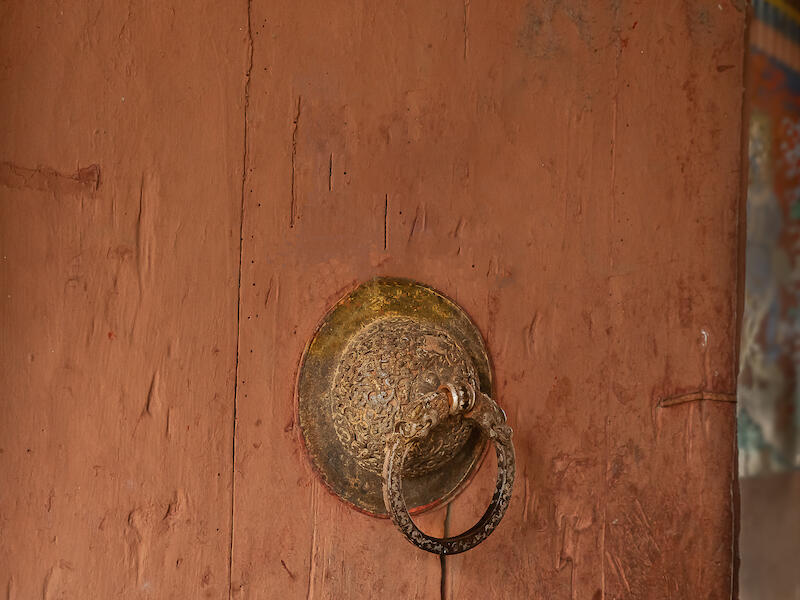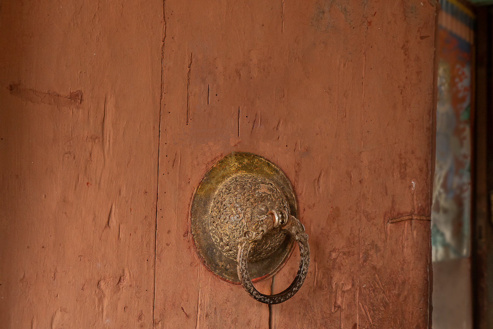 The textured , ornate door knocker contrasts nicely against the smooth wooden door. Having the door ajar gives us a peek into the monastery adding to the story. To take this image to another level I would suggest having the edge of the door parallel to the border. The slight vignette works well to keep my eye in the picture.