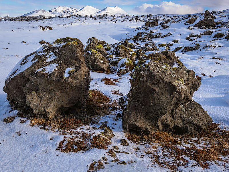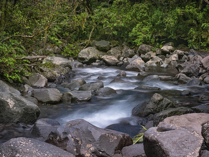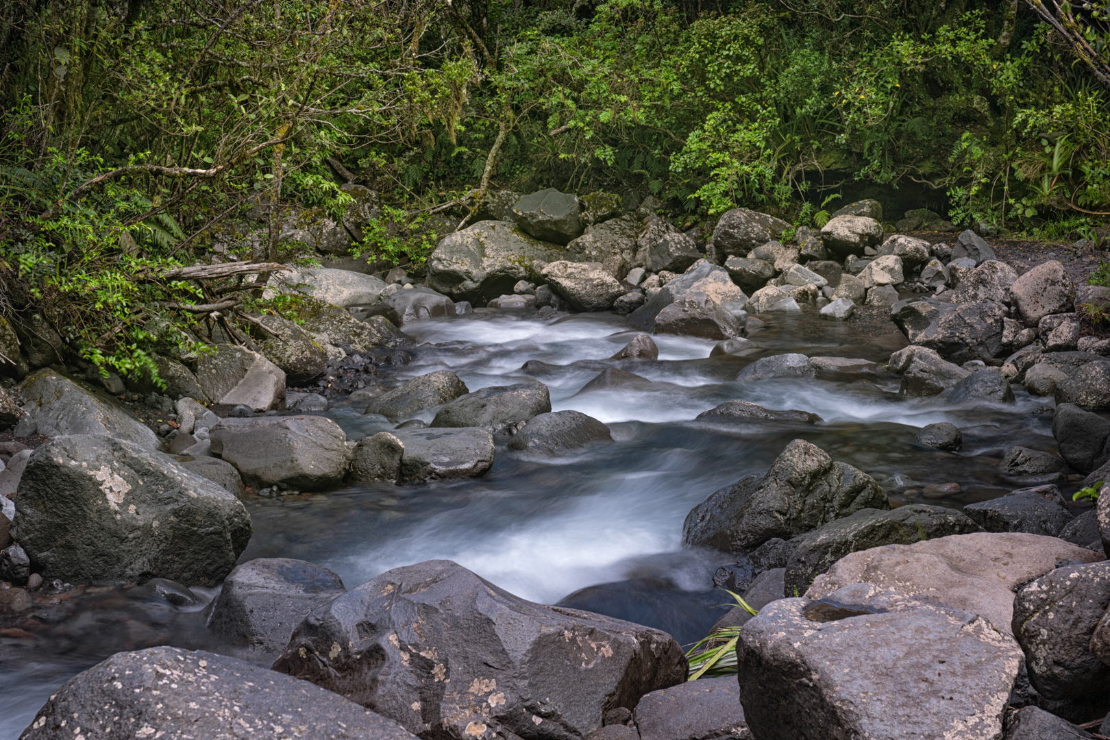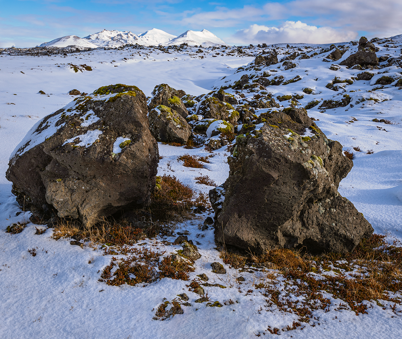 The rugged black crater is a good contrast against the milky white water. It works well as a monochrome.