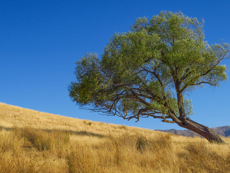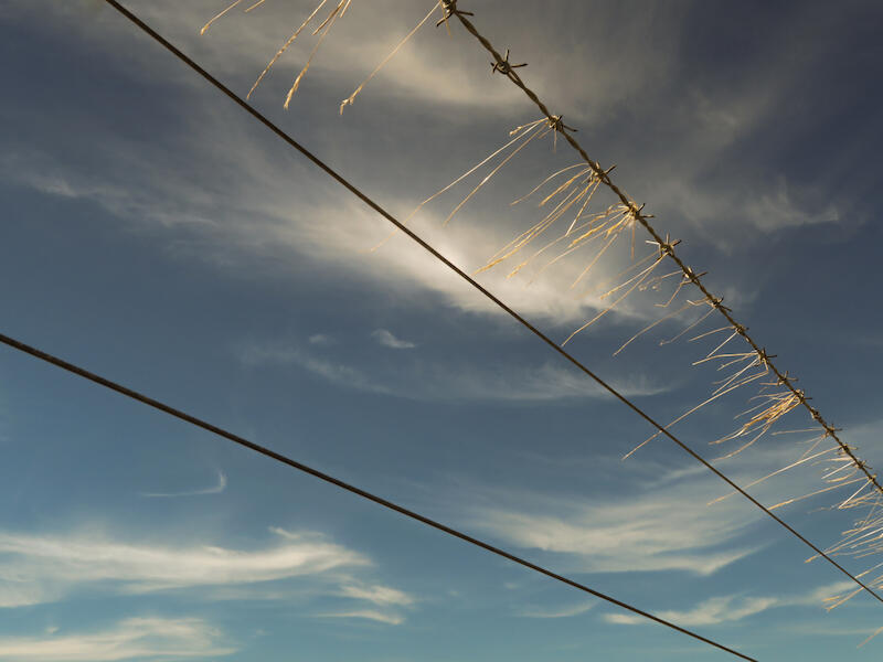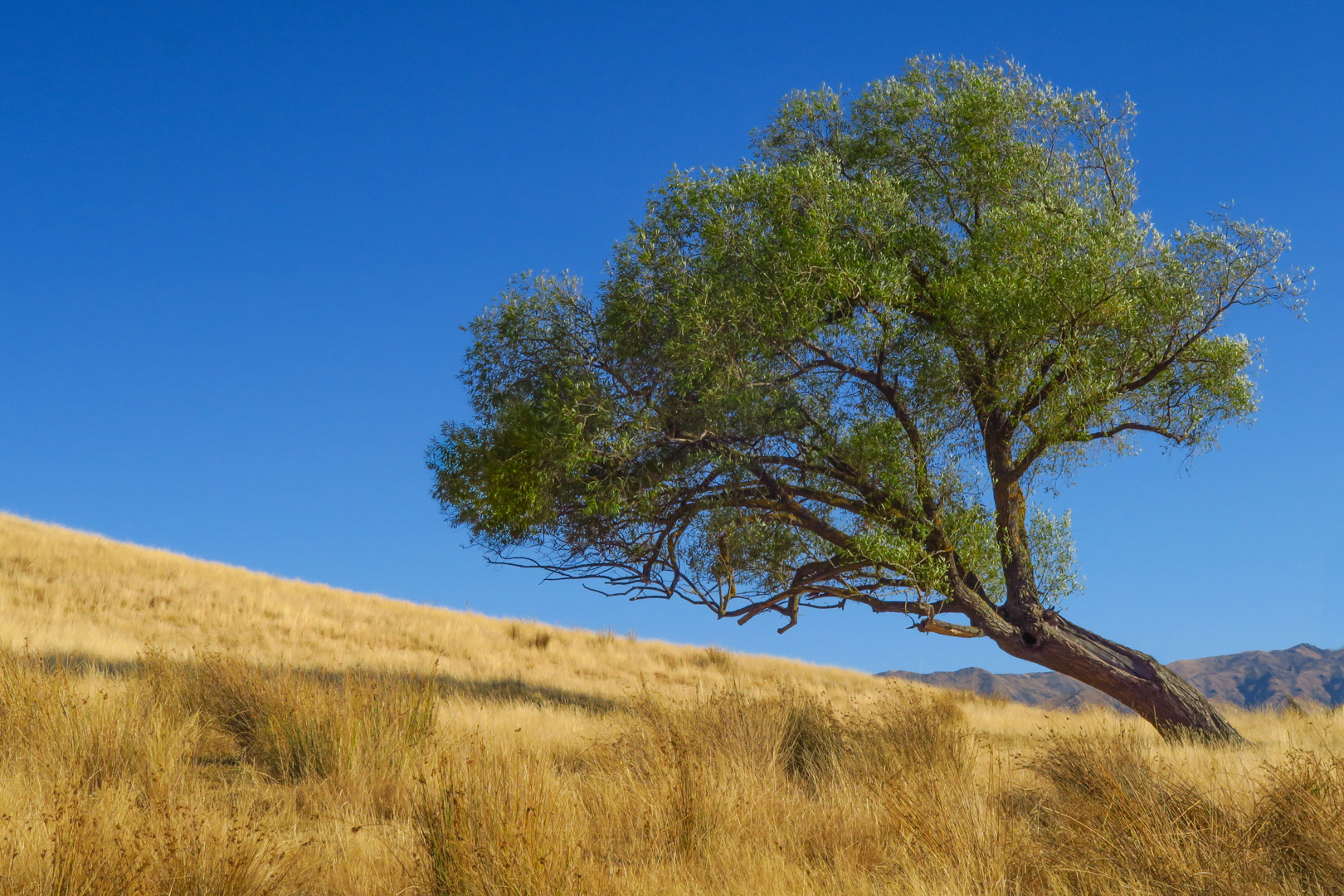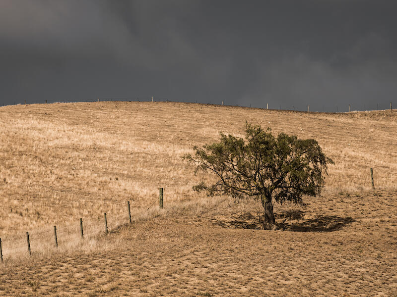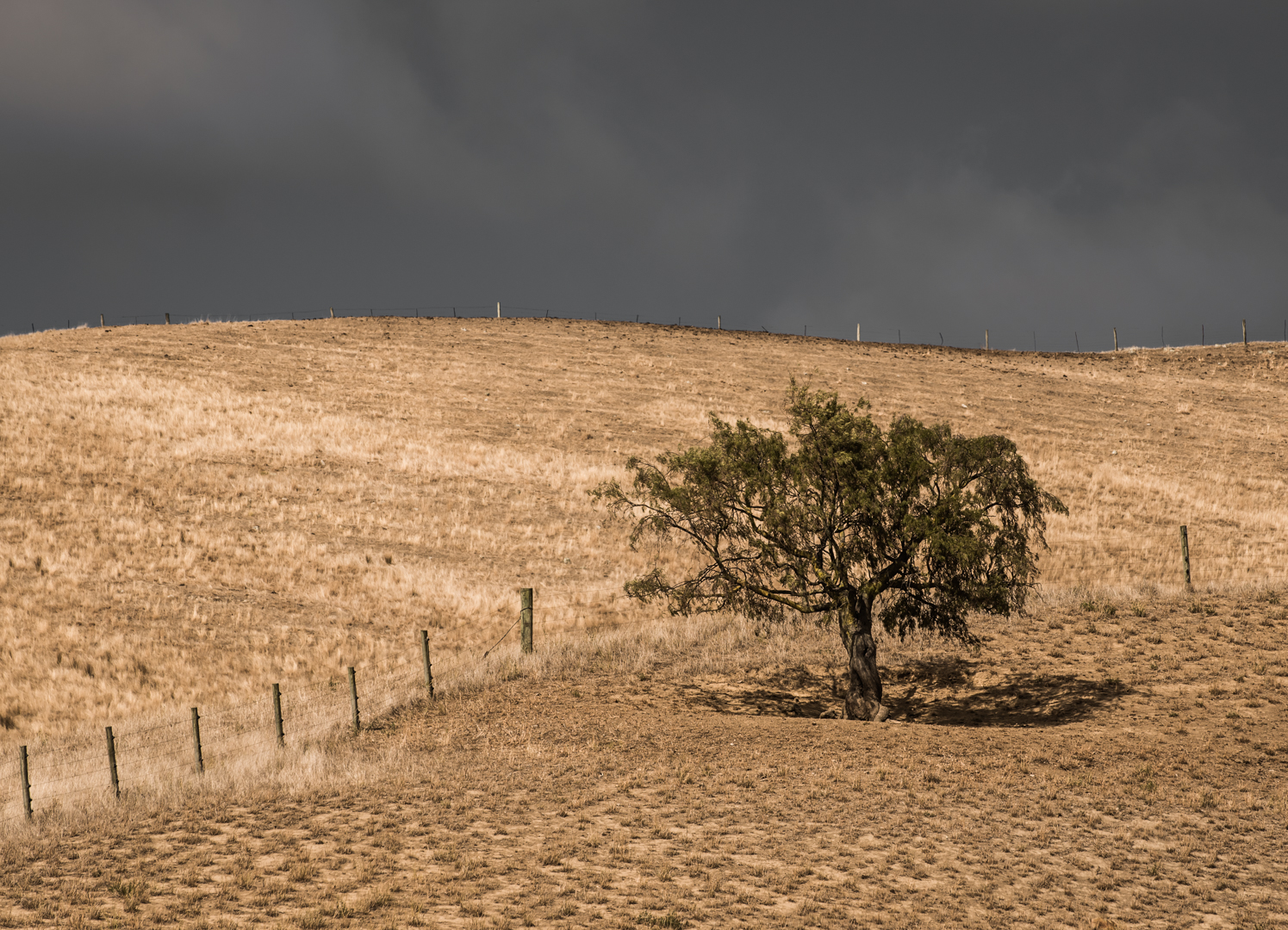 The fence takes our eye right to the tree, sitting on a third of the image. We then proceed up to the horizon line and the moody blue sky. Lovely colours.