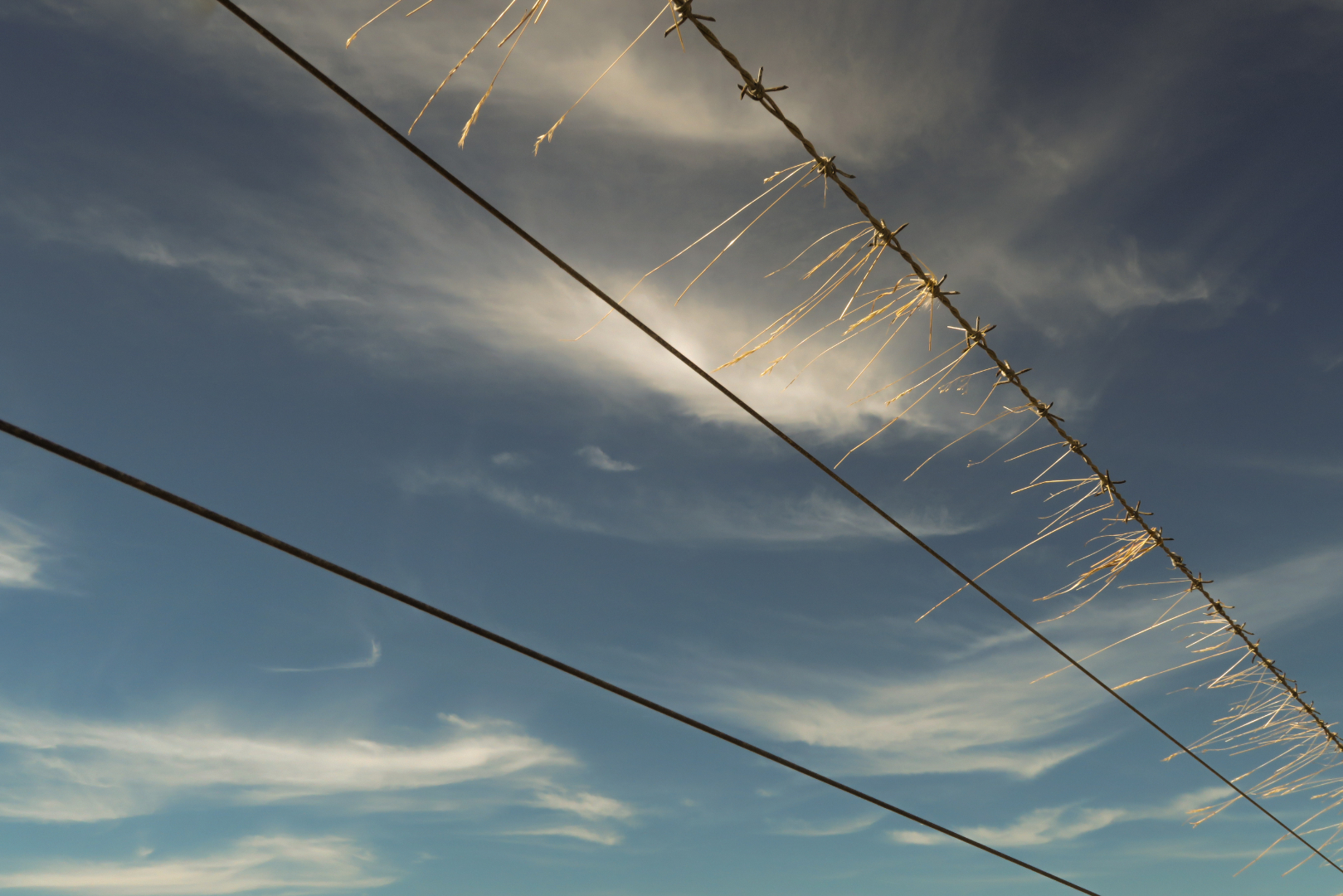 Good title. These prayer flags have seen better days. I love the graphic elements in this image. The diagonal lines, blue sky and wispy clouds all work. Well seen.