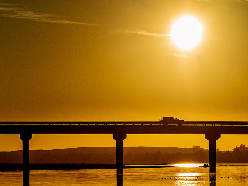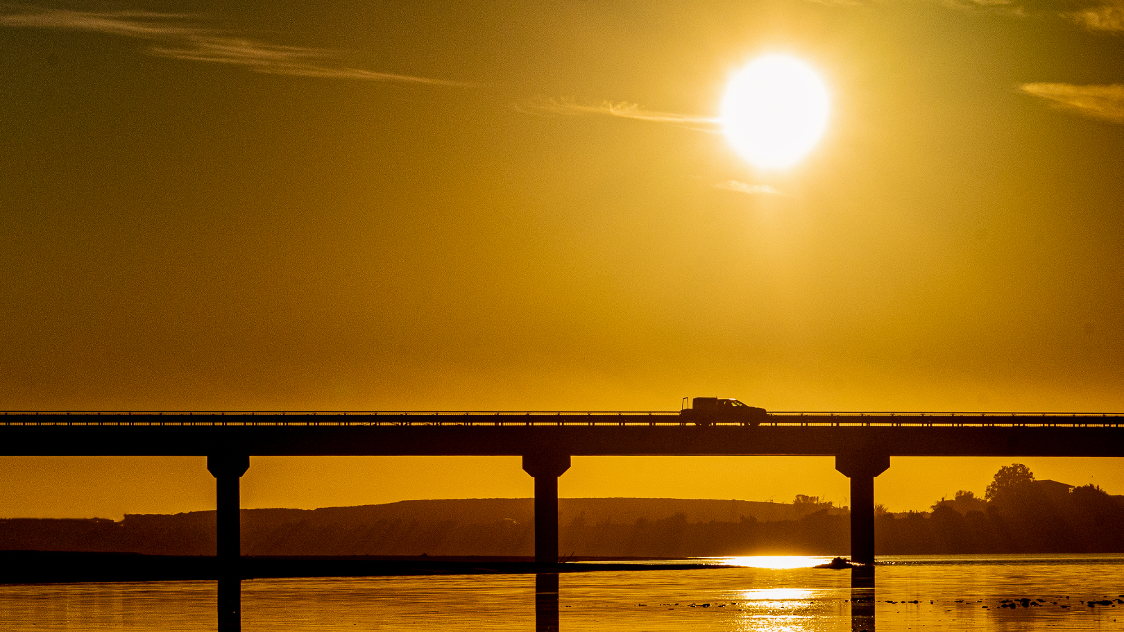 Wispy clouds chasing the sun while the lone truck heads on an adventure. Great composition. It's simple but tells a story with the trees and houses on the shore being great supporting elements. There's a very nice feel to this image.