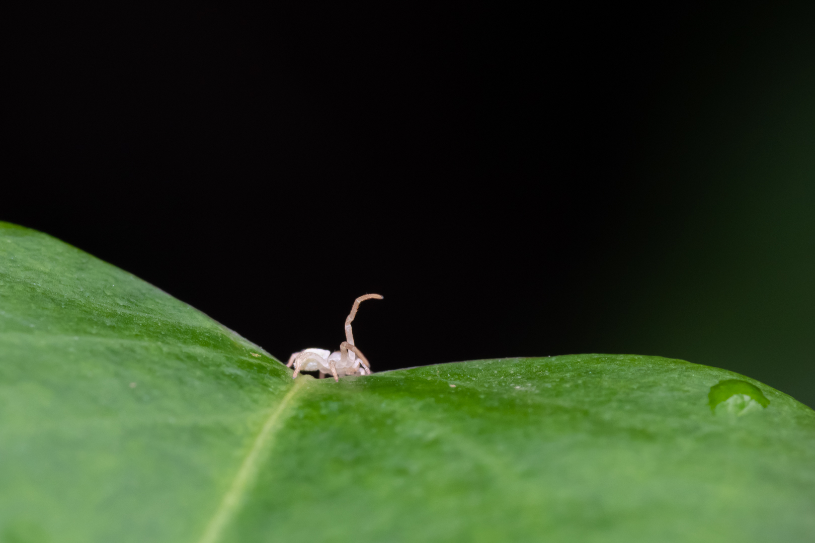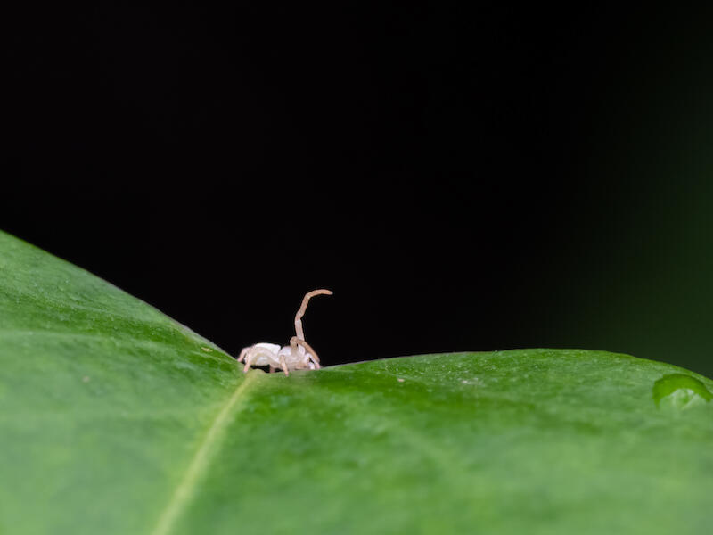The green leaf really stands out against the black background. The spiderling seems in the midst of taking a giant step, perhaps to get a drink of water. I enjoyed this image. It's very graphic.