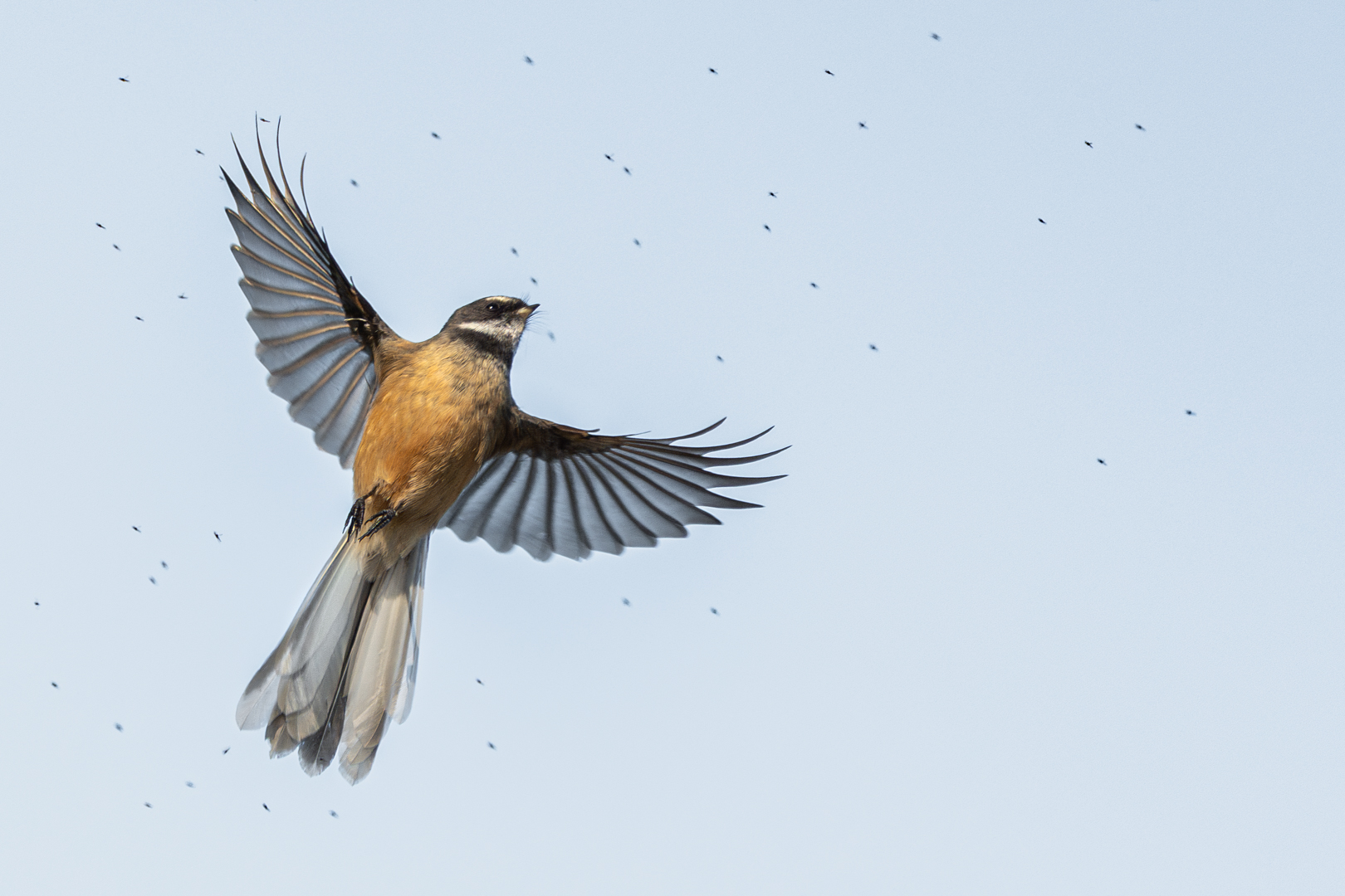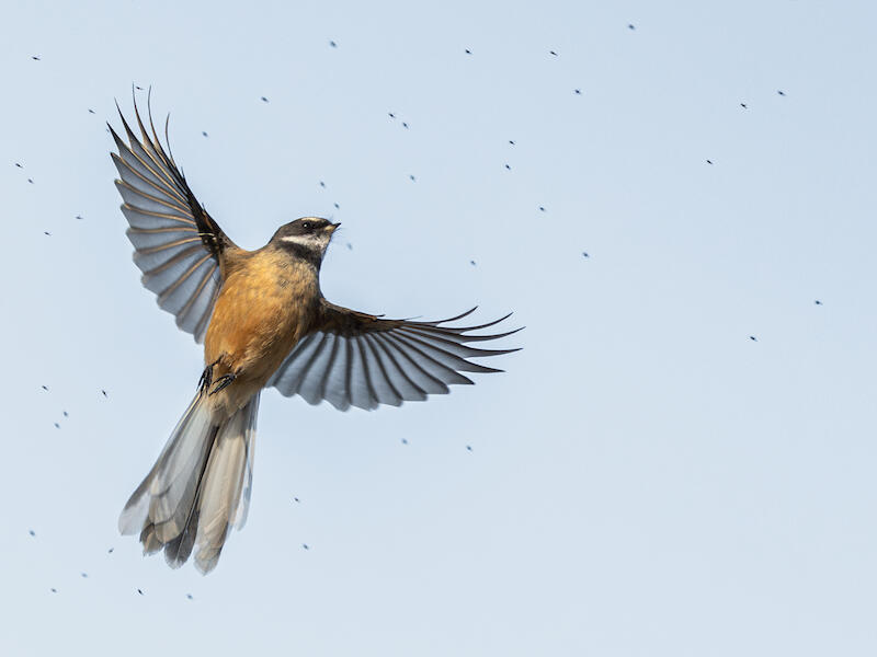 Pied Fantail, I was interested to hear you call it that because I never hear them called Pied Fantail. In fact, I had to check. And of course, it is one of its names. We, like on Tere, calling them Pi Waka Waka, which is the one of the many Maori names for Pied Fantail. And it is used by local Iwi but I like this I like this representation of the bird. It's crisp and sharp. We're seeing it in the air, not seeing its tail out in a fan, but nonetheless, it's diving after the insects, and I love that we're seeing the insects in the air that it's chasing after. I think that's really cool, and that's been very well captured. They're hard to capture when they're in the air like this, and you've done a great job, so well done.