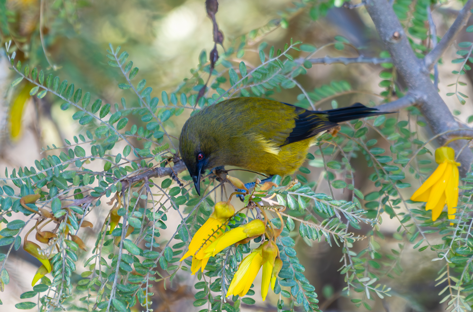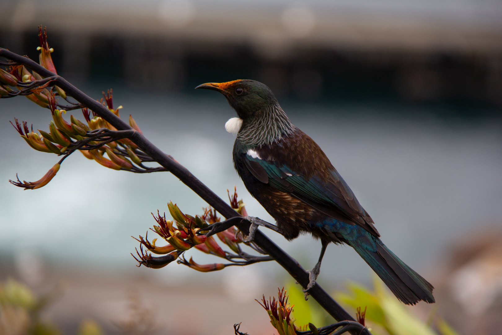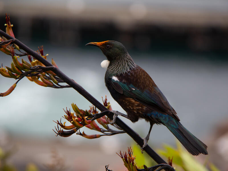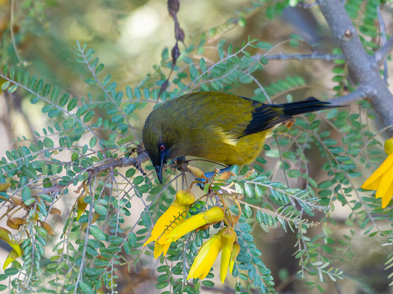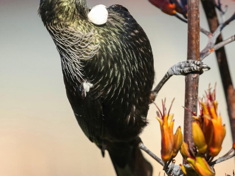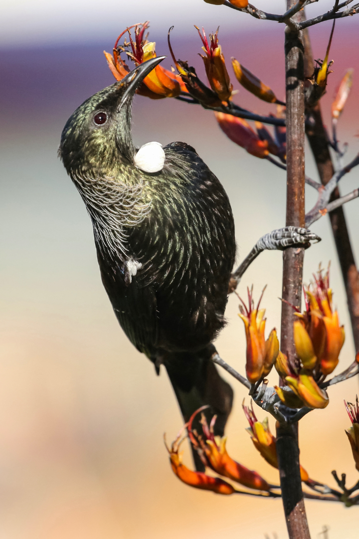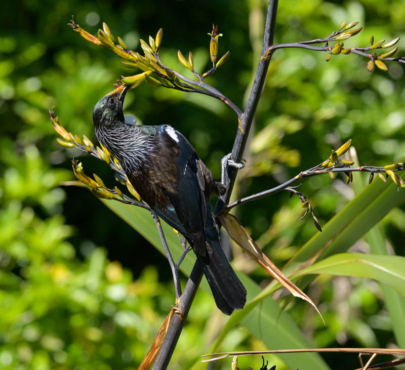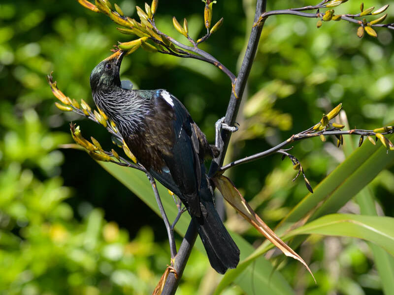 Tui (Prosthemadera novaeseelandiae novaeseelandiae) feasting on flax. And this is the yellow flowering flax it's a smaller variety and no less appetizing to the tui, I'm sure. It's a nice capture. I like the dynamic, an angle that the bird's on, just the eye and the neck feathers are not critically sharp in this image. And that's unfortunate. Also, the bright greens of the BKI background very strong, and it would be nice if that could be controlled a little more somehow. Perhaps a little less vibrance in the image might make it less eye striking. So those are my thoughts on this one