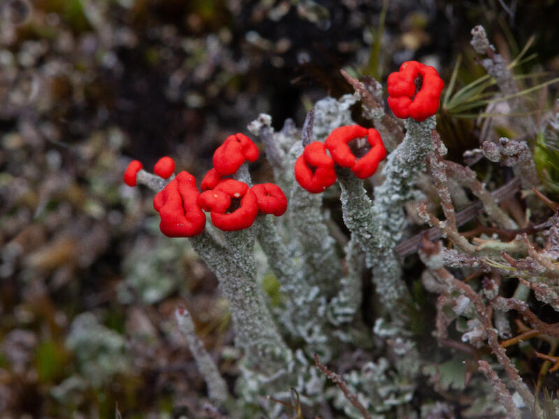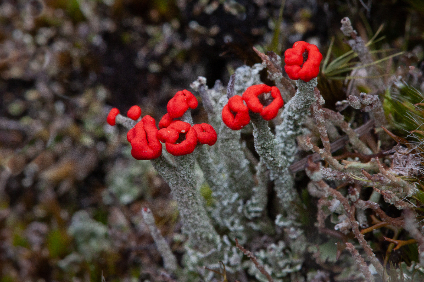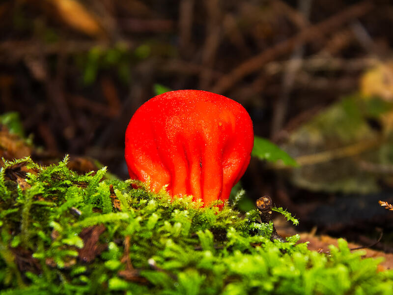 Leratiomyces erythrocephalus. This is interesting these, I think fruit buds off a What do you call it? I think that's what they are and beautifully captured here. The red's quite vibrant. Once again, I think there's just a tad too much contrast here. There's not much else to say. I would have liked the red lips at the top to have been crisply sharp and they're just not quite crisply sharp throughout. But it's lovely to see this species in, in bloom like this and thank you for showing us.