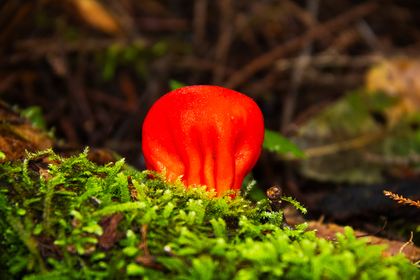 Paurocotylis Pila Berk. I think it's been well seen and captured. It's very strong in its colours and the near mosses that it's growing out of similarly vibrant and verdant green. And I think that perhaps we've just got overdone the saturation and contrast a little bit here. So I suggest that you come back and have another go at post processing this. The image itself is well captured beautifully sharp where it needs to be. The background bokeh is a little bit too detailed and it would be nice if you'd manage to just get that a bit softer, I think. Other than that, great shot.