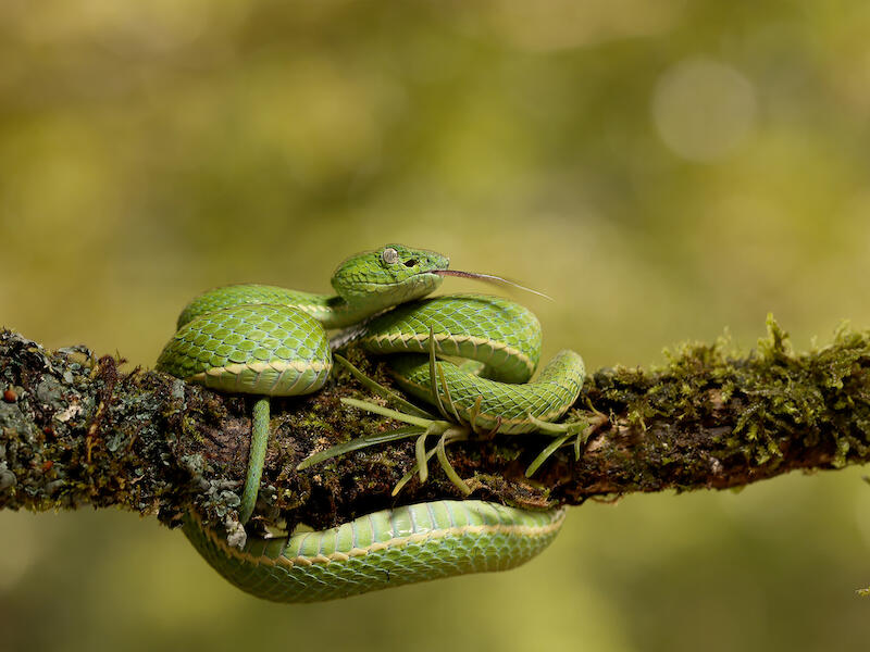 Side-striped Palm Pit Viper. I think has been very nicely captured. I love the way it's wrapping around the branch both above and below and I love that it's crisply sharp, but the background is is diffuse. A lovely Smooth bocky background. For my money I would love to see the colour temperature pulled back towards the blue because it's very yellow sort of a greeny yellow. I think I've seen this image before and I commented last time that it feels like it's in a fluorescent lighting situation or something of that sort because it's quite greeny yellow. And I'd pull that yellow back a little towards the blue and push the tint probably a bit towards the magenta from green and just get a more natural lighting on it. It doesn't want to go away from the yellow entirely but just allow some other colours to show through that are currently being dominated by the yellow. Nice shot though well taken and thank you for presenting it.