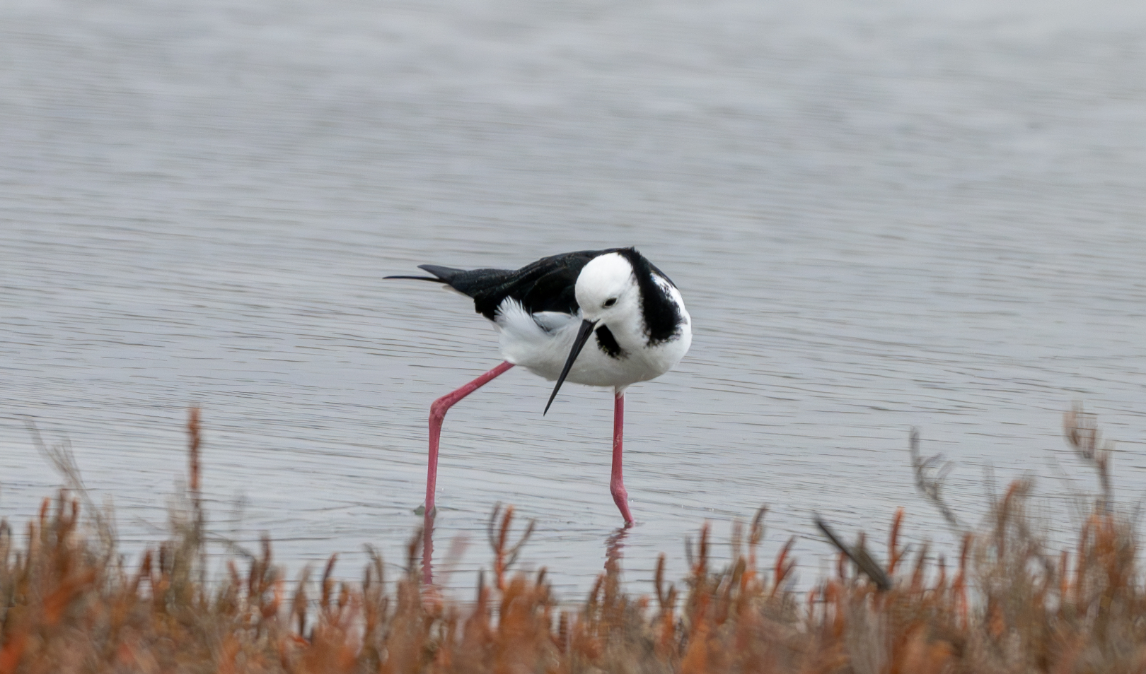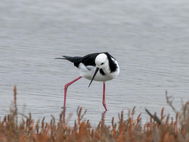 Pied Stilt, Himantopus himantopus leucocephalus. And this is, is showing an interesting aspect of the bird. The way that it's showing its stance here. Think that you have captured it well. And unfortunately it's in flat light. And so we're not really seeing light in the eye, which is A little bit unfortunate. I like the way the bird is looking back, though. And I think that having the bird in the middle, compositionally speaking is not as strong as if it was off to one side. For my money, I would choose to have off to the right slightly looking back into the image. And my suggestion would be that you cut maybe a quarter of the image off on the right hand side. And that might strengthen things up. You could even take some off the top as well and lift the bird a bit higher in the frame. So have a play with that and see what you like. Think about that. You could also tone down the grasses just in the near ground. I think that might help add to a little bit more weight to the base of the image. I, I like the way the bird is posed though and I think it's a very interesting image.