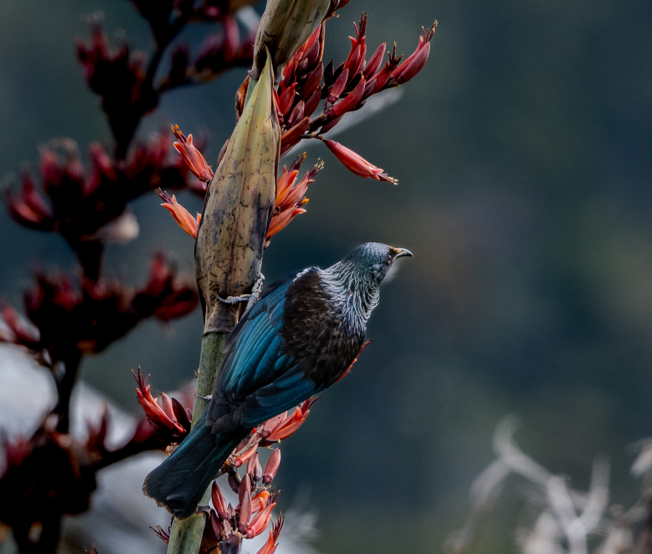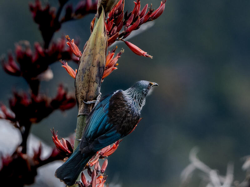 Next up we have Tui, Prosthemadera novaeseelandiae. I fully appreciate the image. And this image on of the Tui on Harakeke is nicely captured. It's sharp throughout so I like that part of it. The Tui is unfortunately blending into the background somewhat and we really are showing a back shot of the bird, and I would really have loved to have seen more of the bird, and particularly its head. You can just see the the crown of gold polym from the harakeke above its beak on its forehead and it would be nice to come around a little bit more to the side and look into the, the bird and the harakeke rather than into an abyss of softness and darkness, which we've got on the right side of the image. But I guess you captured what you could from where you were, and they were probably moving about quite a bit, so it's nice that you got the image that you did. So well done for that. Nicely exposed, by the way. I think it's very nicely done with a great depth of field.
