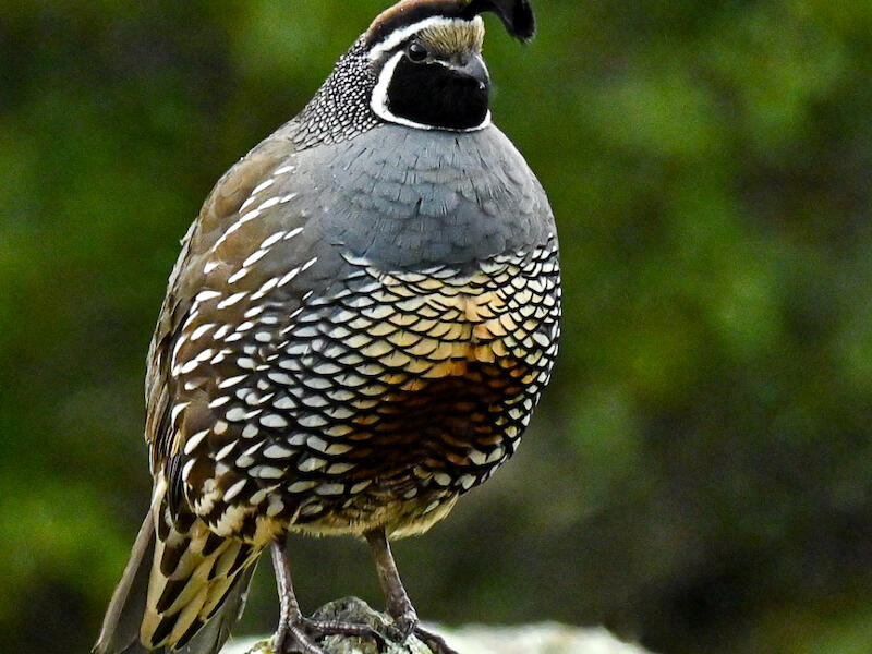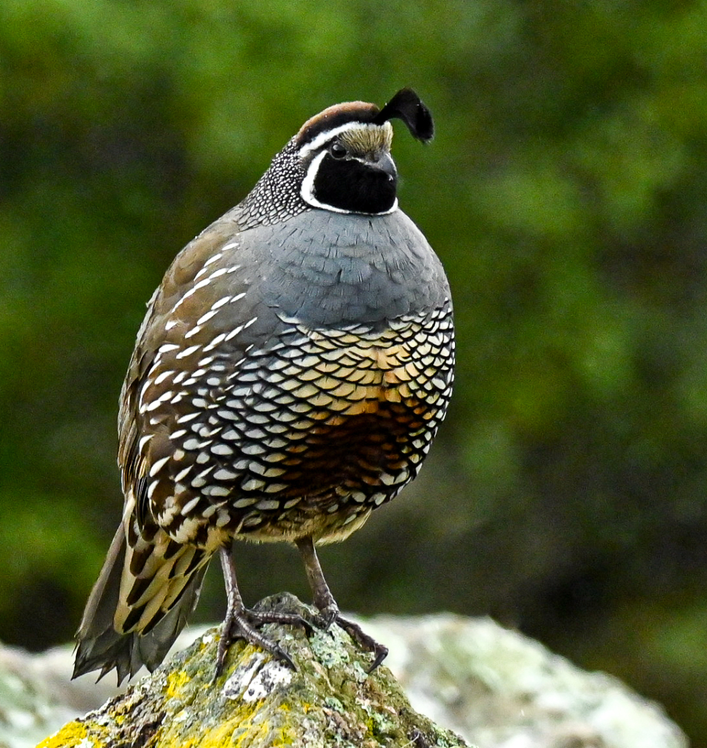 California quail, Callipepla californica brunnescens. This is nicely captured and composed. I think I would rather have seen a little more brightness in the exposure here. The rocks in the background behind the little rock that the birds perched on, that's quite bright. So you might find you need to tone down the highlights, but you also need to open up the shadows. The breast where it's orangey in the middle is in deep shadow, and we're missing detail there. We're also missing detail under the bill in the black area. I think this just overall has too much contrast otherwise it's well captured. You also have a bit of a noise problem in this image and you could tidy up that noise and make this a better image. I think the bear bones are good there's just a little bit more post processing to do on this image. Those are my thoughts here.
