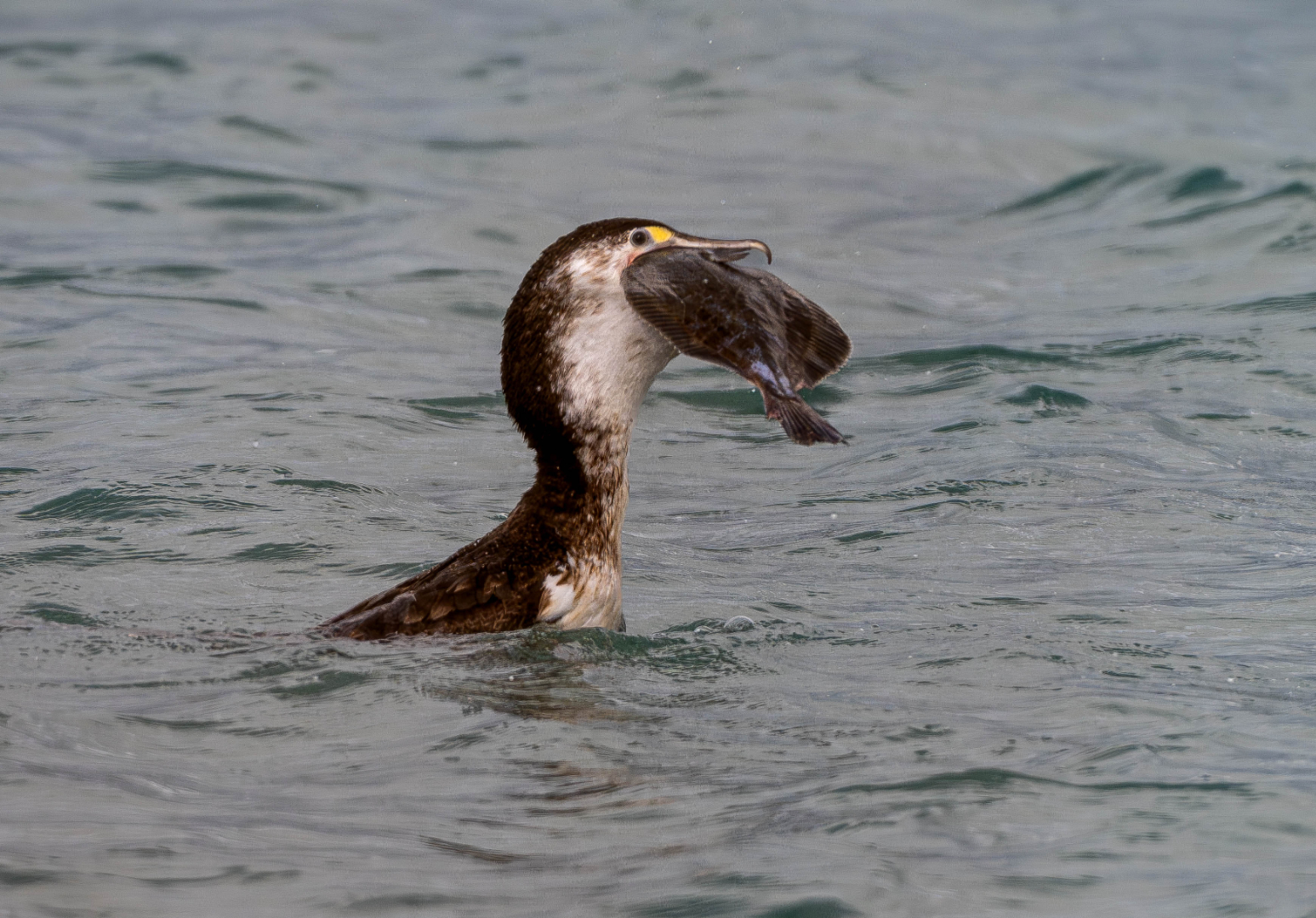 Pied shag, Phalacrocorax varius varius with Flounder. And never ceases to amaze me what these birds are capable of choking down. I assume it choked it down and they certainly seem to have very stretchy jaws and throats. So well done on seeing this and capturing it. I think that's well seen and well, well done. I think that you probably could have focused in or cropped in a lot more closely and just shown us the shag and the flounder, and that would have made them a more important part of the scene and that would have been beneficial, I think. We're a little bit light on sharpness here and I think maybe that once again this is an image that might have not been full frame and been cropped in so that might just be a lack of sensor data to start with, because I can certainly see that the image itself was sharp when you took it. So, well done on seeing something really interesting in the natural history world and capturing it. That's great.