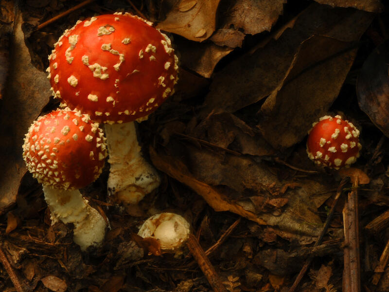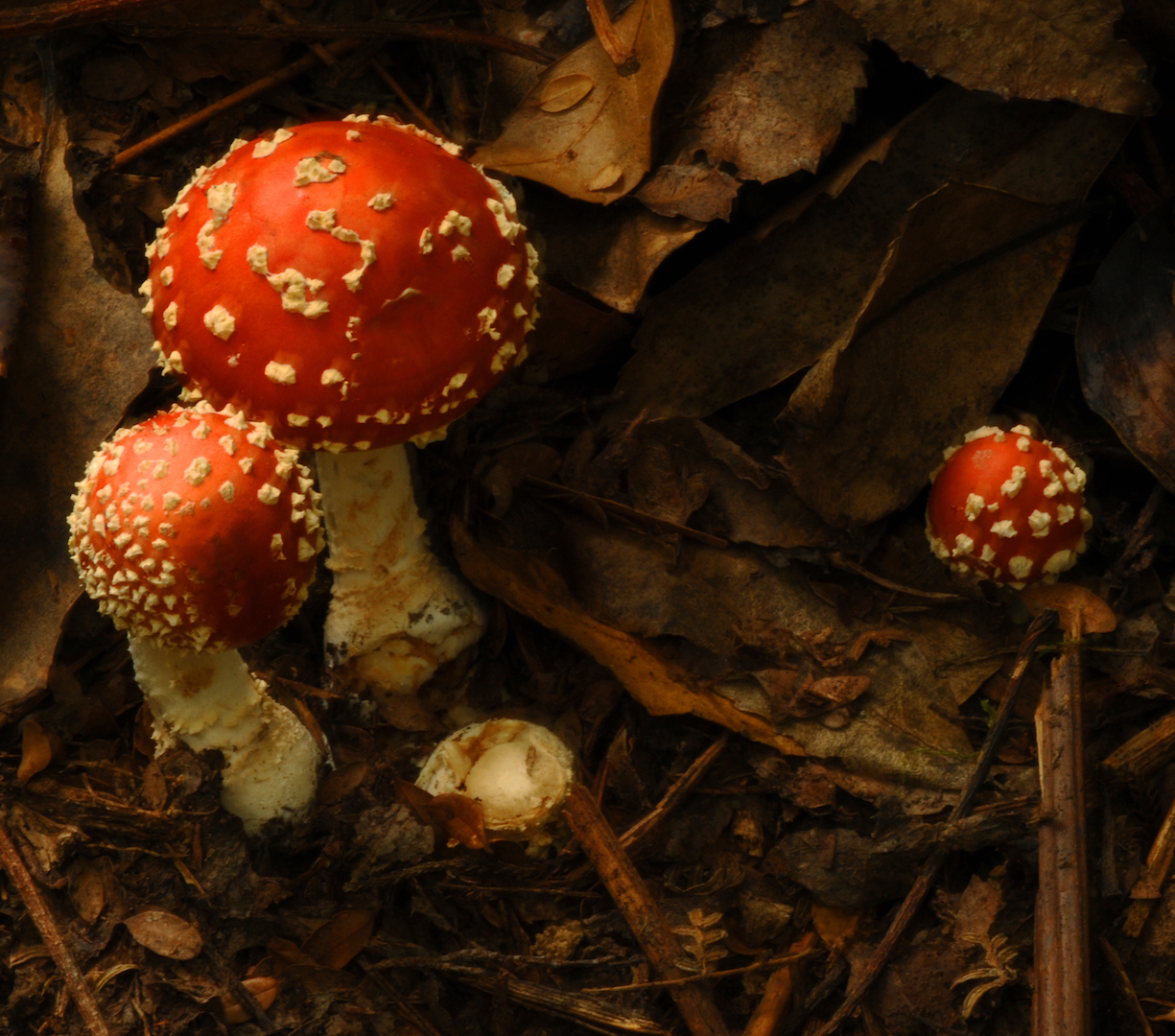 Our third image is Juvenile Amanita Fruit-bodies. I like the triangular composition of this image, with the three main caps in red forming a triangle. That's a pleasing sort of composition. I think that you found yourself in quite difficult light here and that has resulted in the right hand side of the fungi not having Uh, as good a light as would have been best to put on these and I think some sort of reflector on the right hand side, reflecting back into the fungi would have helped I suspect you've either photographed this By hand, or if you were on a tripod, you've had a little bump in the process of photographing it because we have ghosting around the caps which is just unfortunate. We also have a somewhat yellow tone to the image, which I think in a, in a dark forest we'd be more likely to see a tone of blue than a tone of yellow. So you've perhaps tried to warm it up, but I think perhaps it's gone a little bit too far. But those things said I, I do like the composition of this and thank you for bringing that to us