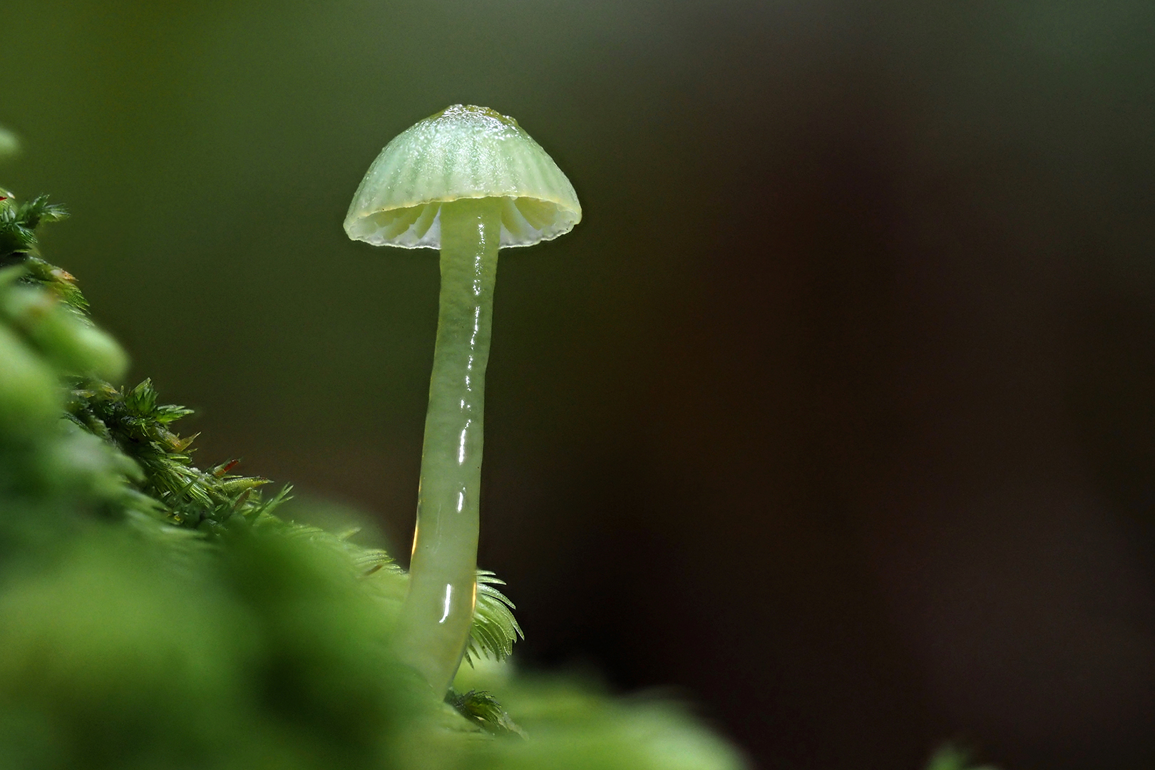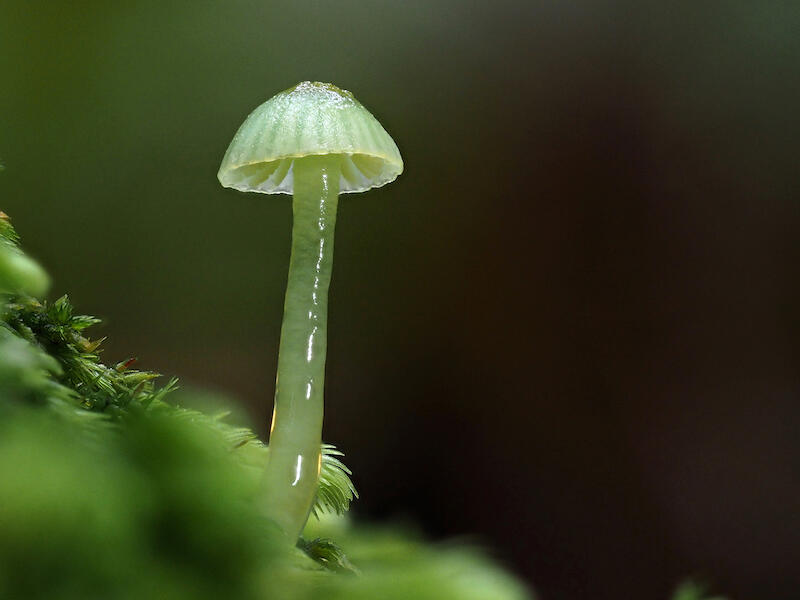 Gliophorus viridis. This is a lovely image of this stem. I love the way that the light is reflecting without being glary off the cap, and we've got on the Glossy stem, we've got light reflection as well, but not too much, and it's not burning out badly. I have a couple of issues. One is that we're not seeing the base of this funky fungus and the other is that we've got a lot of nothing happening on the right hand half of the image. So probably you could have presented this as a portrait image and cropped in quite a bit. It's also a pity that the near ground is strongly green but very blurry. And I think that could only have been solved by having a bit more depth of field in front, so at least we got a little bit more detail in that blurriness. But I do like that we're seeing the gills and the, the fungus itself is brilliantly sharp.