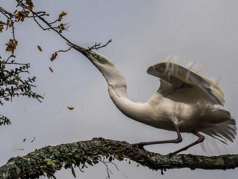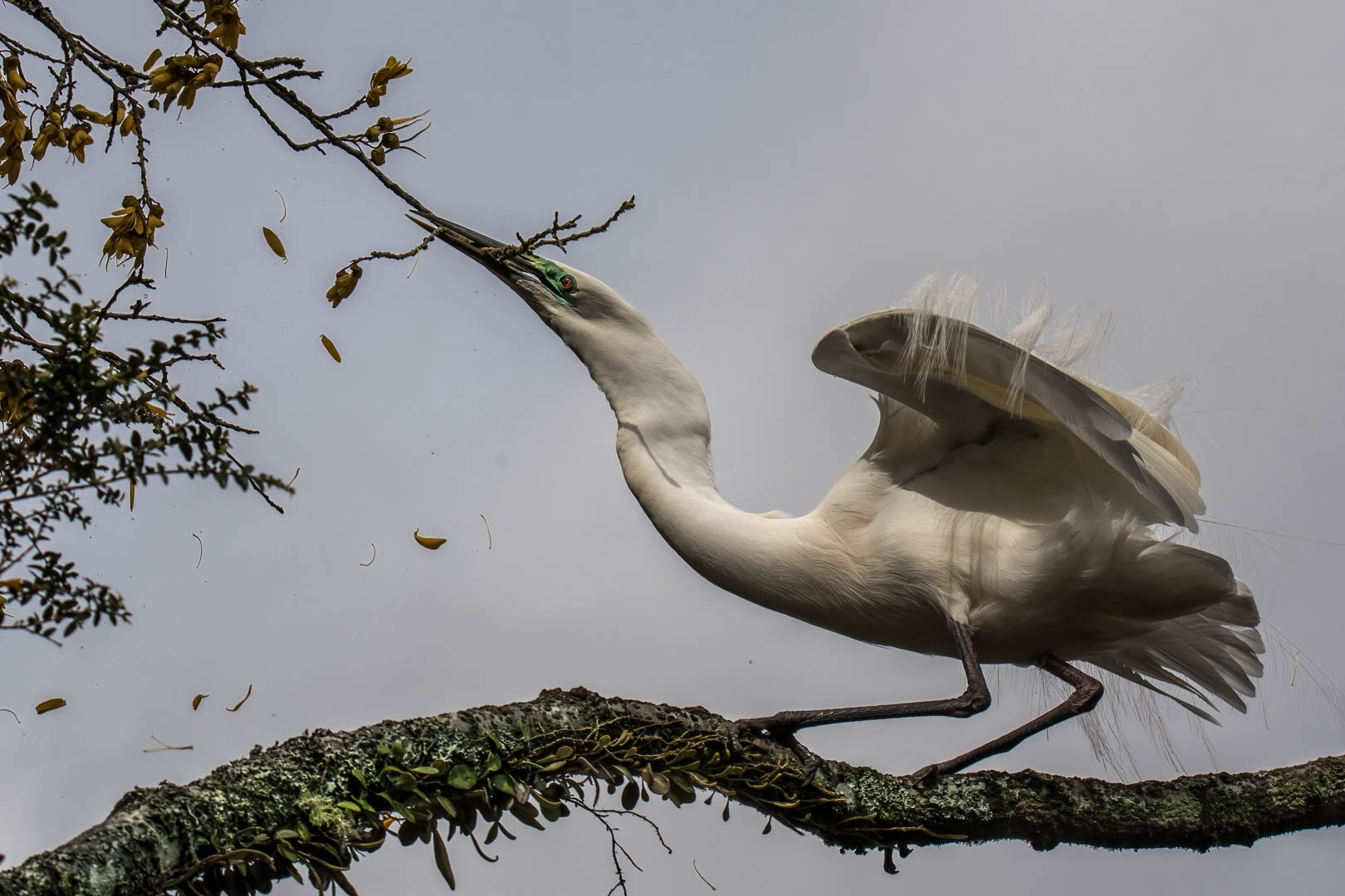 Kotuku is next. And this bird is clearly wrenching at the branch on the kofi tree. Probably trying to break something off for its nest. It's certainly in breeding plumage, and we can see that floating everywhere above the wings on both sides, so that's nicely seen as well. I think that we can improve things quite a bit here by opening up the shadows and cutting back on the contrast a little. That'll give us a bit more detail in those shadows. Probably just push the whites up a little. That will just make the bird seem more white. It also will give back some colour to the yellow cofi as well in the process. So those are my suggestions for improvement here, but great shot nice composition and well done.