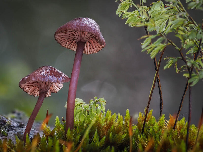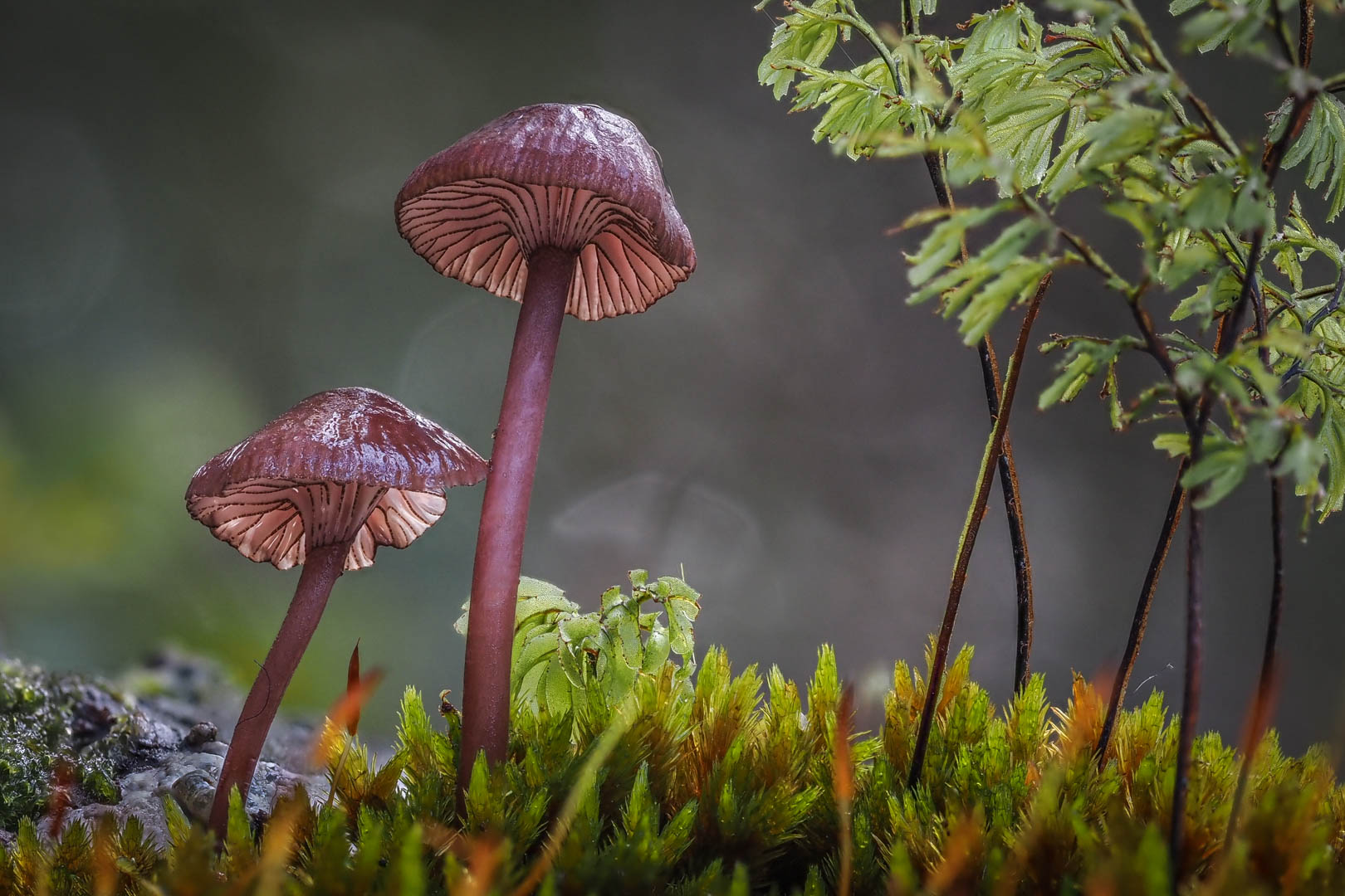 Mycena Lividorubra. This is beautifully sharp on the Mycena itself. The caps are glistening and sharp and the gills very nicely pronounced and sharp as well. I wonder whether we need the fern to the right hand side and whether you might have made a picture here without those ferns, which are largely redundant in the story. I mean, they give us a bit of a background, but we still see the mosses in which they're growing. And I think we'd have had a stronger image without the ferns. The right hand side here. Otherwise though, beautiful representation of the species nicely crisp and, and sharp with a lovely diffuse background. So I'm, I'm enjoying that. Thank you.