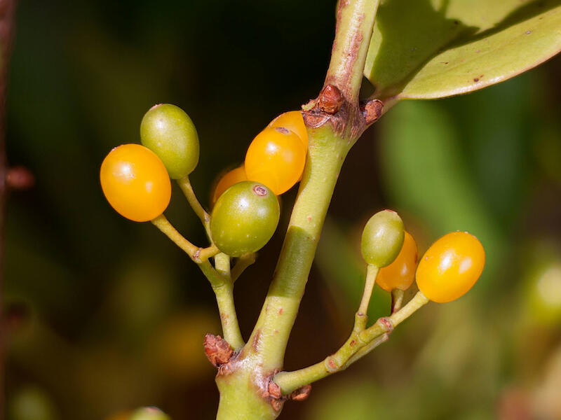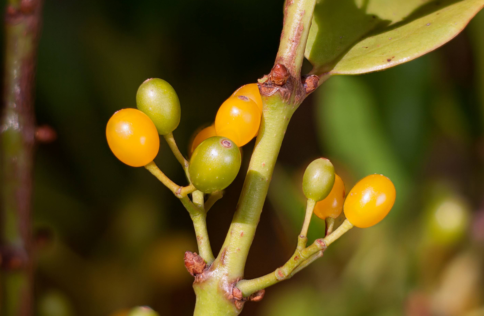 Ileostylis micranthus. This is the New Zealand mistletoe, and I think it's a nice capture of the fruit in this image. We've just got some specular highlights that are a little bit bright, and it might have been a good idea to just try and pull down the exposure, maybe the highlights a little as well and that would not recover those specular highlights, of course, because they're off the charts. But the image itself is just a little bit overly bright and it needs to come down a tad on the exposure side. It's a nice representation of the species though, and we could certainly identify it from this. And I think it's a very satisfactory natural history image.