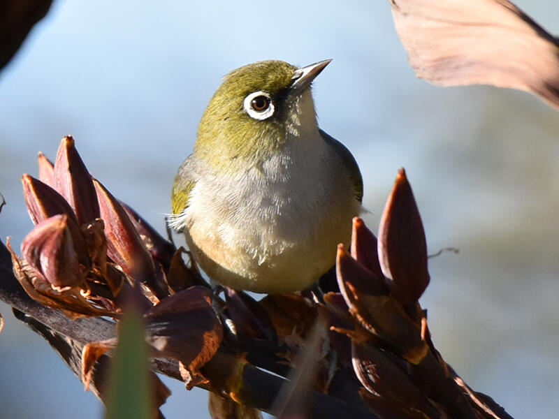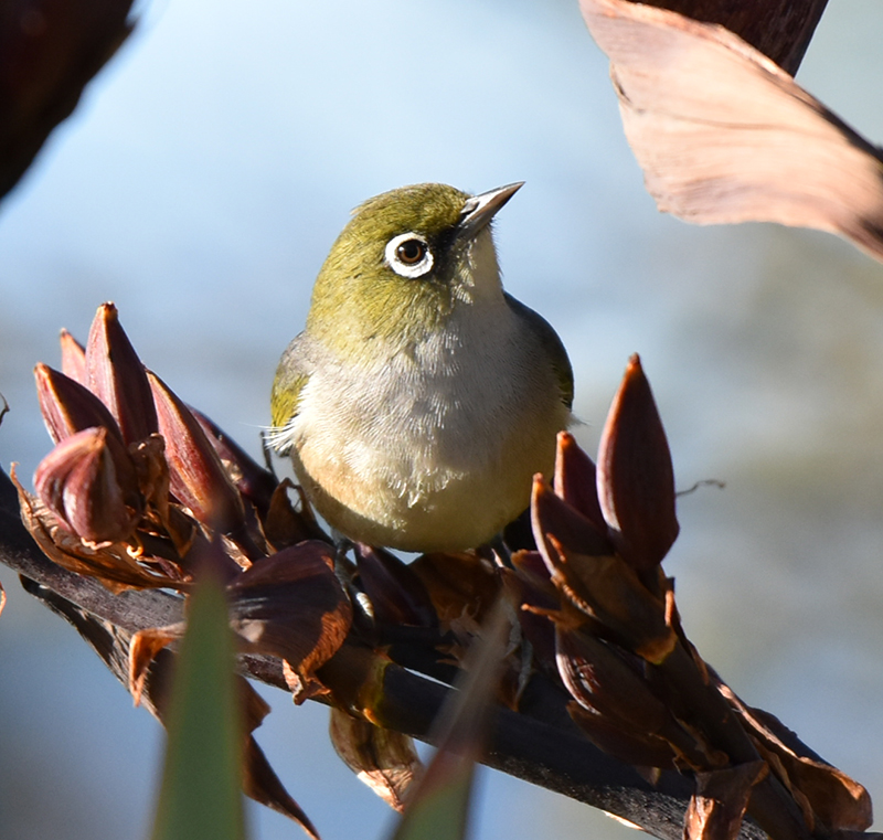 Silvereye (Zosterops lateralis lateralis) on flax. And indeed it is. It's a nice capture of this bird as large as you've given it to us, it seems to be sharp, but we just don't have enough data to know whether it's truly sharp. The compositional issues with this are the trailing bits of the harakeke in the top left and right corners, which just they're out of focus and they're big and they're demanding of attention and it's just unfortunate that they are there. You could try cropping around, those and in closer on the bird and you might end up with something usable, but it might end up being cropped too closely. So I couldn't guarantee that would give a better result, but just a thought for you to try.