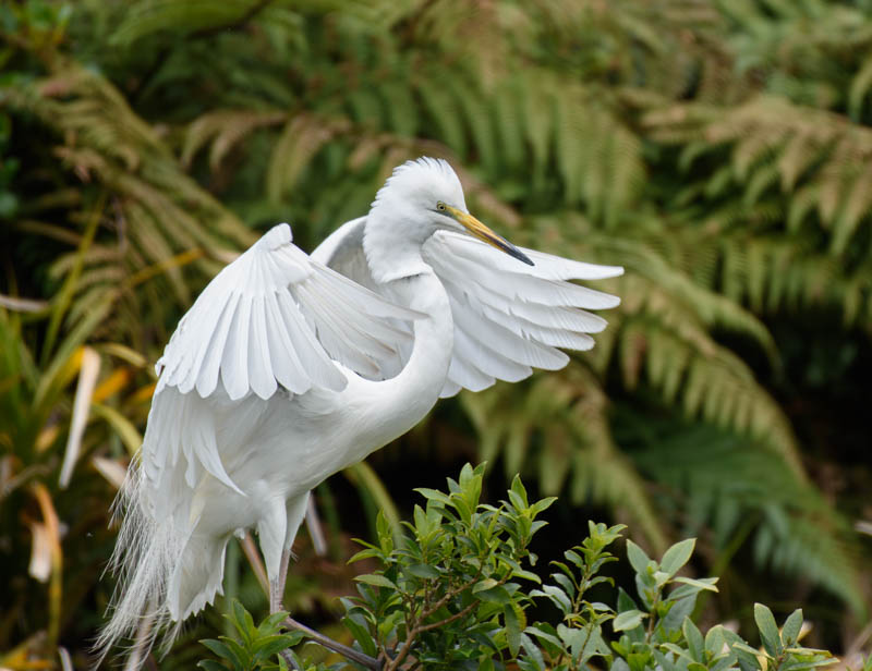 The last image is White Heron (Egretta alba modesta) (Kotuku) on display. This bird is in its breeding plumage, we can see. And it's got nice feather detail and seems to be generally sharp as well. So all of that's good. The main criticism I have is that you have a gap at the top and the legs are chopped off at the bottom. And I think if you had aimed your camera just a tiny bit further down, you'd have got the whole bird in the frame. And that's what I would've liked to have seen. Apart from that though, it's a very nice capture of this bird. And well done.