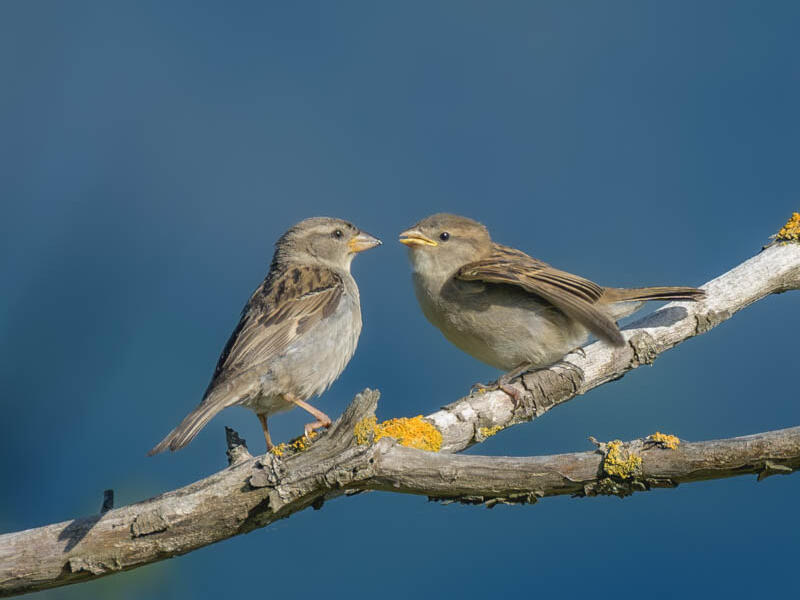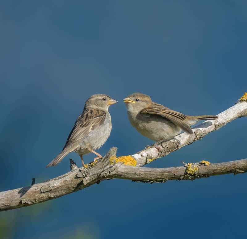 Sparrows (Passer domesticus) in conversation. And the conversation that they are having is, please feed me mama. The bird on the right is a chick, and you can tell by virtue of the yellow gape in the corners of its jaw and its wings are extended and fluttering and this is classic feed me behaviour. You clearly didn't quite press the shutter at the right moment to capture the bird feeding its young. The moment was right there before you. But it is a nice moment and it's pretty sharp.
