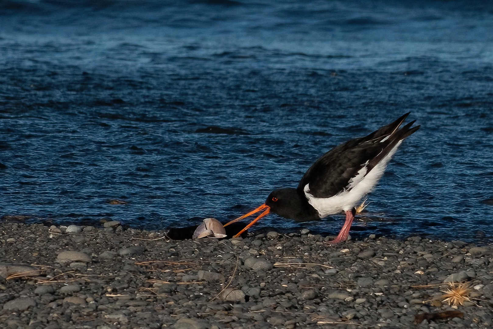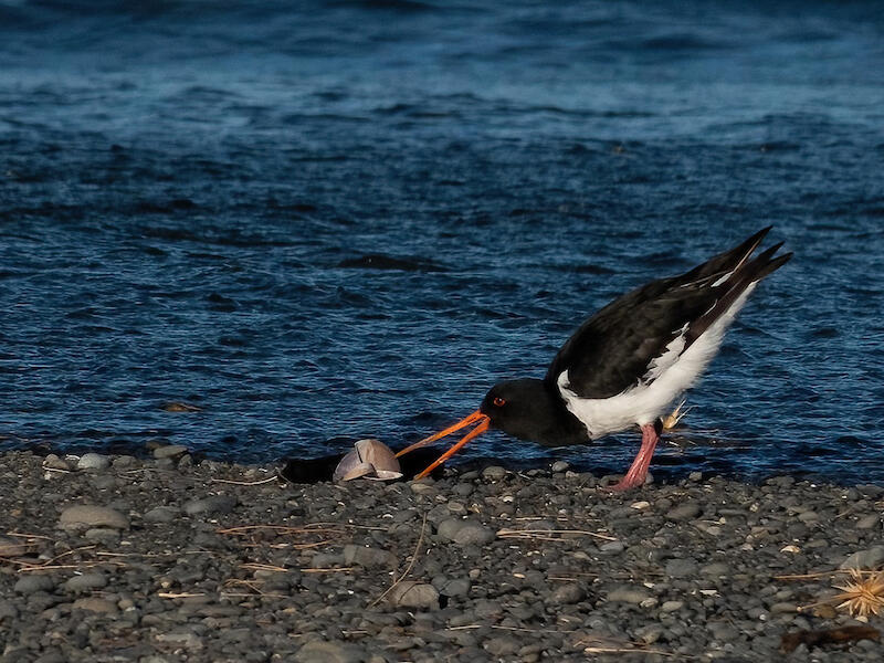 Oyster catcher. This is an interesting subject. I'm not sure, it looks like some sort of weird shell that it's turning over, but I don't recognize what that would be. It's definitely got a degree of sharpness, but it's not got sufficient definition, I guess. And we're just losing a little bit of crispness about the image. I think you'd have done better to come in closer on the bird, or crop in closer, one or the other. I don't think we need all the beach and ocean around the bird that we're showing here. But otherwise, I do like that the bird is largely sharp, and the eye is showing highlight. We're seeing the colour in the eye all of that's working well. I'd love to know what it is that it's tossing over on the beach. That's all I have to say on this one.