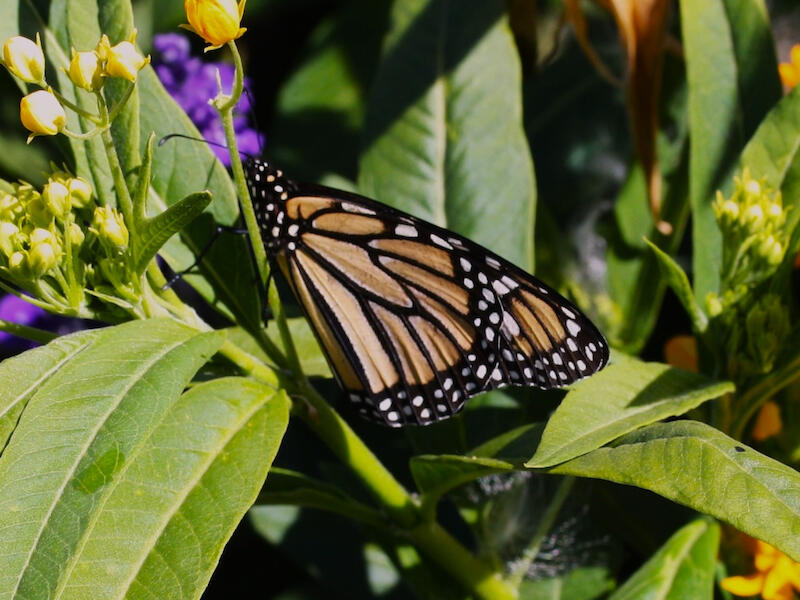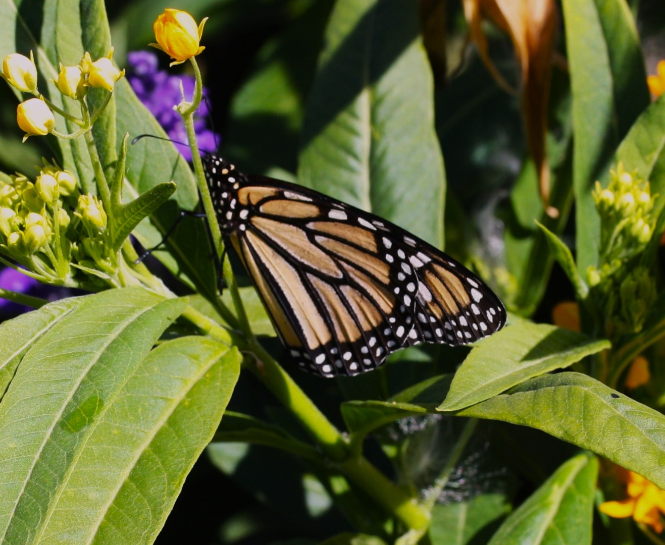 Monarch butterfly. You've captured the butterfly well here. It's just unfortunate that your depth of field was a little bit wanting. You can see in the bottom left corner how beautifully crisp and sharp the leaves are. But by the time we get to the Monarch it's the nearest bits of it are just in focus. But none of the head or antenna or legs are in any way sharp and probably had a good enough depth of field. You just hadn't focused in sufficiently to get that depth of field to encompass the whole of the monarch. The yellow flowers are a little bit burnt out and you probably need to pull down the highlights in this one. Probably open the shadows a bit. Apart from that there's not much more I can suggest here. And just be thinking about that depth of field the next time you tackle one of these.