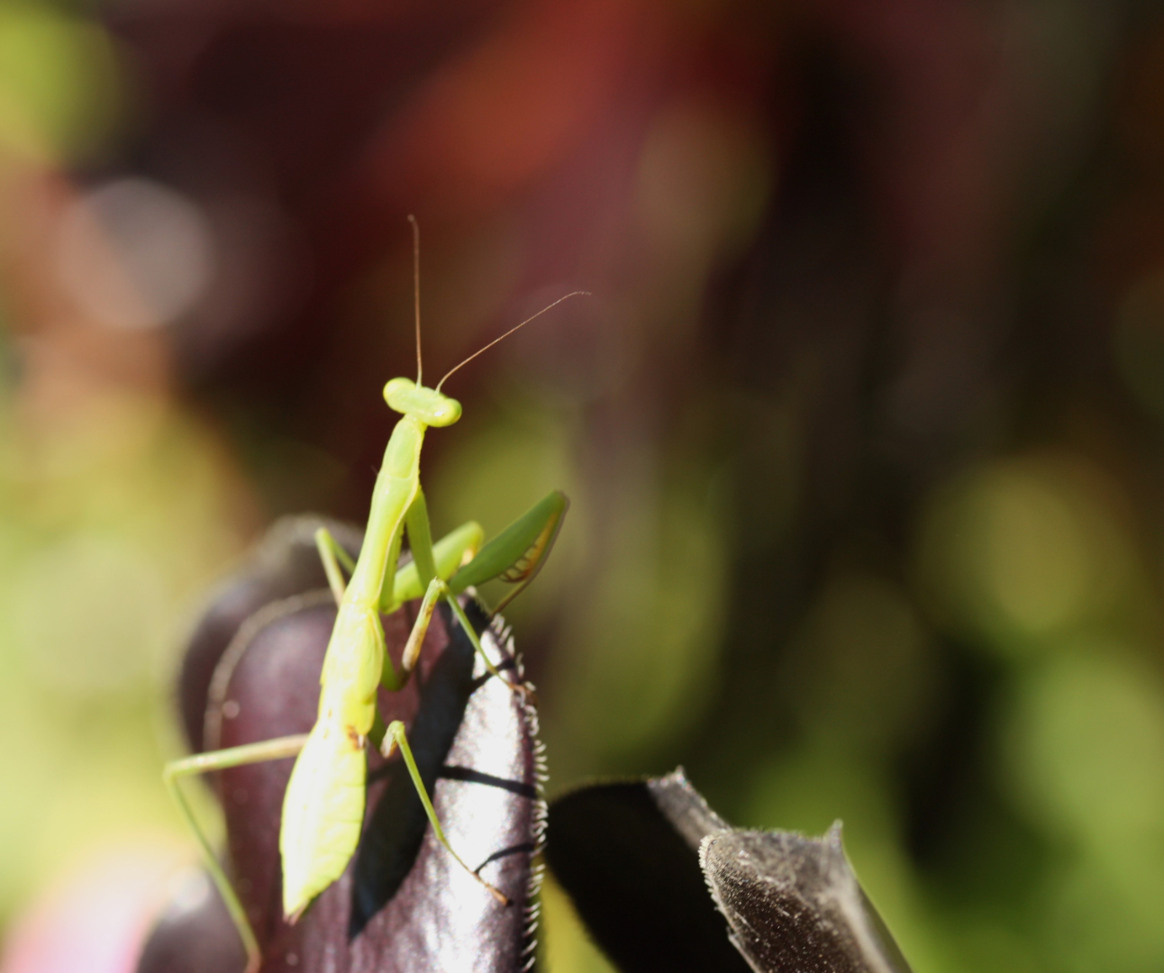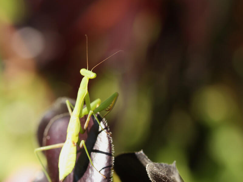 Mantis. The clear and obvious issue with this image is that it is not sharp almost anywhere in the image. And that's exacerbated by the fact that the exposure is overly bright on its thorax and is burnt out. So this is a case I'm afraid where you need to go back to the drawing board and try again. You'll need a better depth of field in the near ground in order to get the mantis. The next time you have the opportunity sharp but you've got the falloff in the background just right and your bocce is very beautiful and soft and just how I like it. So well done on that front.