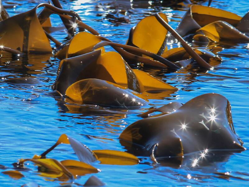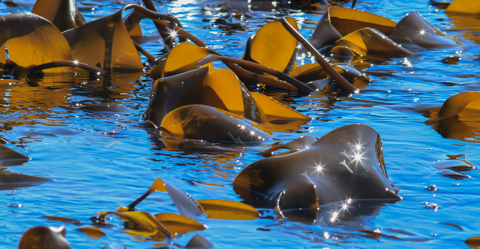 Laminariales – Kelp. We are certainly seeing kelp. We don't get much of an idea of what it looks like, unfortunately, but that's just because it's floating on the surface. My general impression of the image is that it's somewhat busy. We're seeing lots of bits of kelp but not really getting much of an idea of the shape of any one bit, and we're seeing lots of star shaped specular highlights which are quite distracting, so that's just unfortunate. It presents as quite a busy image with some difficulty knowing quite where to focus on this one.