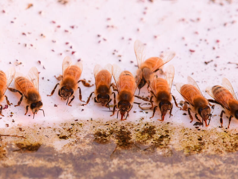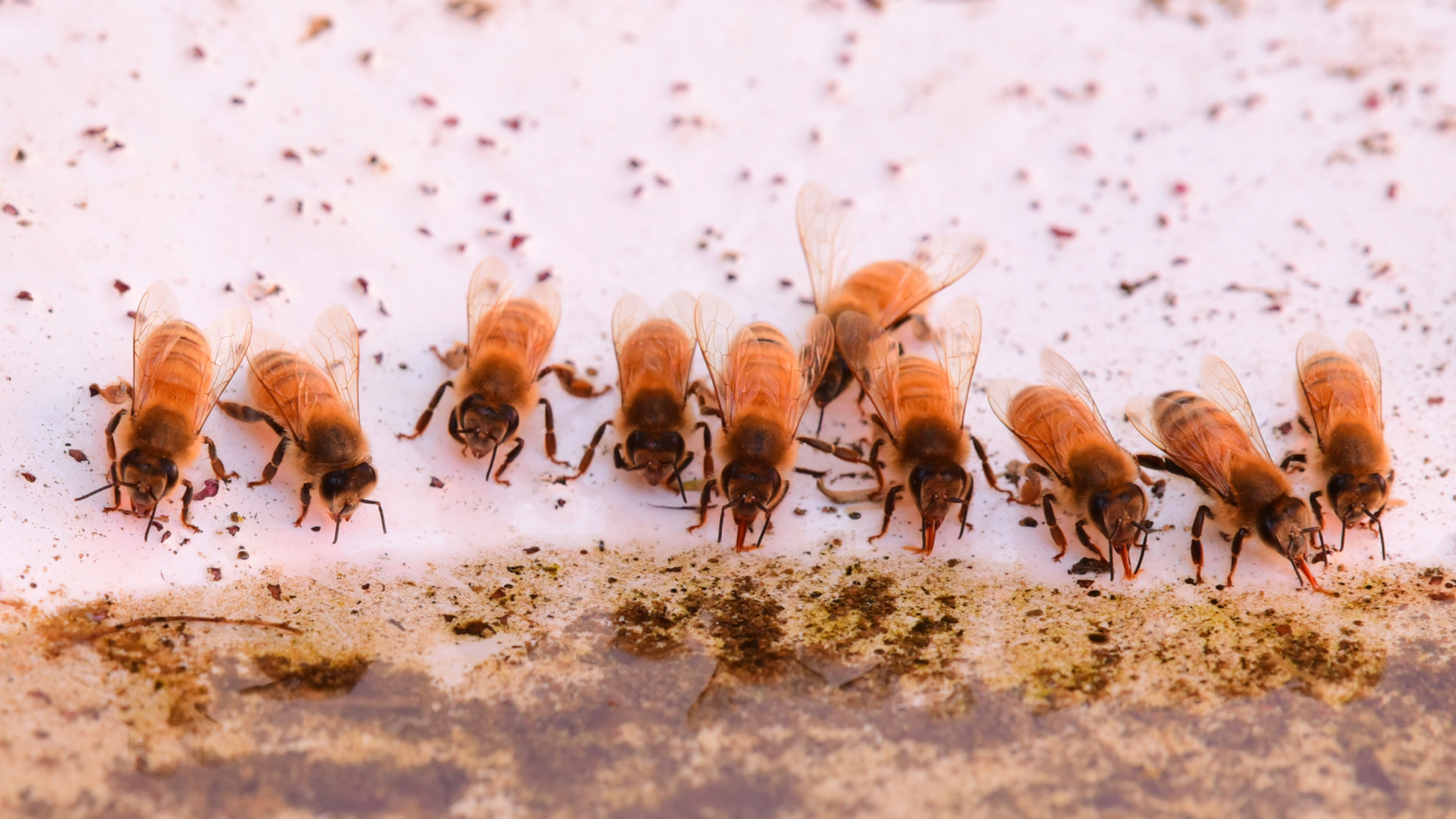 Bees Drinking. This is an interesting image, I'm not sure what they're drinking at. Maybe it's a birdbath or something like that. It looks like it could be something along that line, especially with the white background to it. And this is interesting but there is an unusual quality about this. It's got a softness about it that's unusual given the degree of relative sharpness we're seeing in the wings. And I don't know why that is, but, you know, we're not really seeing any of the the hair in any detail. It's quite fuzzy. And that's unfortunate. Even just looking at it from a distance, it doesn't look quite natural somehow. There's something wrong with the image quality here. Is an interesting subject though and it's interesting to see the bees drinking like this, which is not something we often see. So congratulations for that.