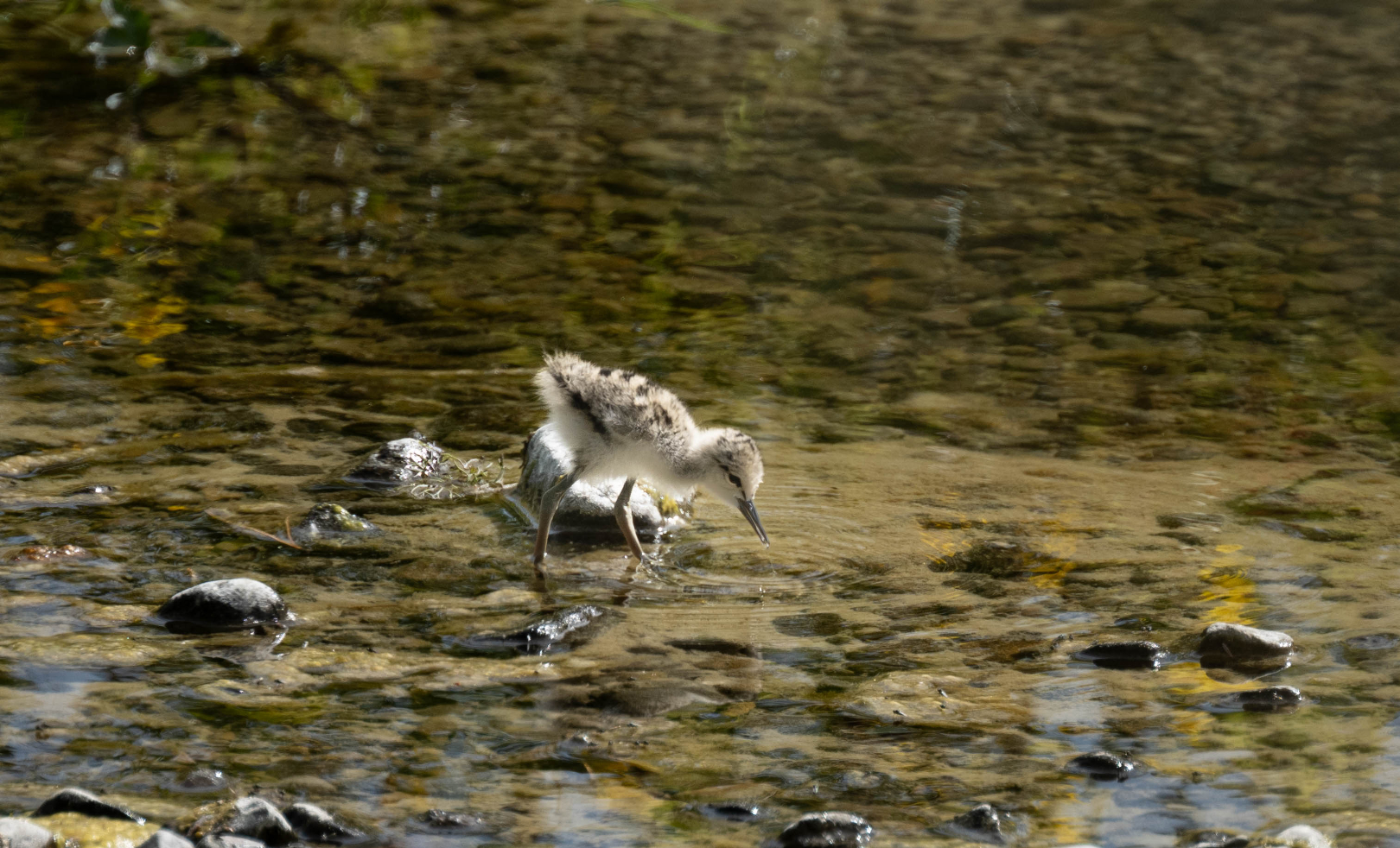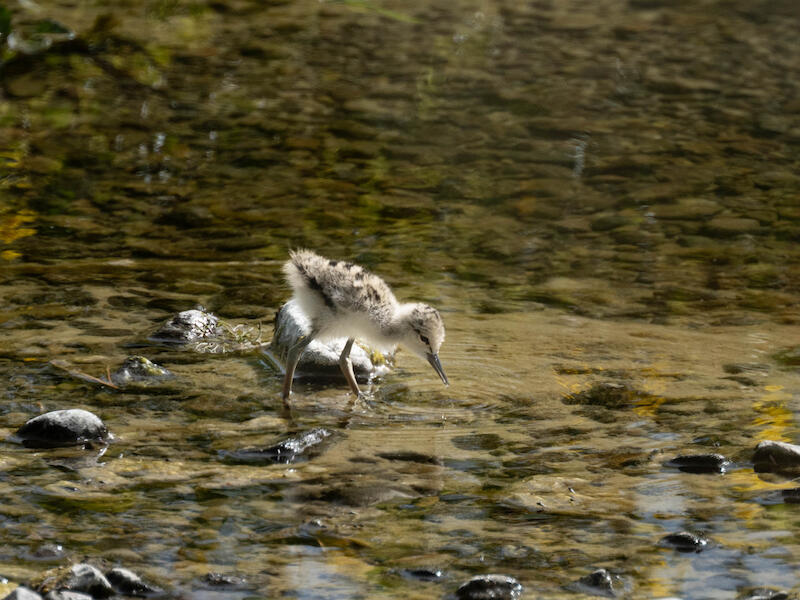 The next one is Pied Stilt Chick, Poaka - Himantopus. And this is a nicely captured image too. I like that the bird is doing in the shallows and that we have the water dripping from its beak and the ripples from that radiating outwards. The light on the bird is, is quite lovely just once again where, we do have backlight here though and so the near side of the bird is not as well lit as I would like to see. It's also very small in the frame and I think this is another image where you really needed to zero in a bit more. And taken, you know, the, just the, the near rocks around the bird and the radiating ripples and, and the bird. And cut the thing down to about a quarter of the frame that you captured. I think if you were to do that, you'd find you have a much stronger image. But I enjoyed this one and thank you for showing that to us.