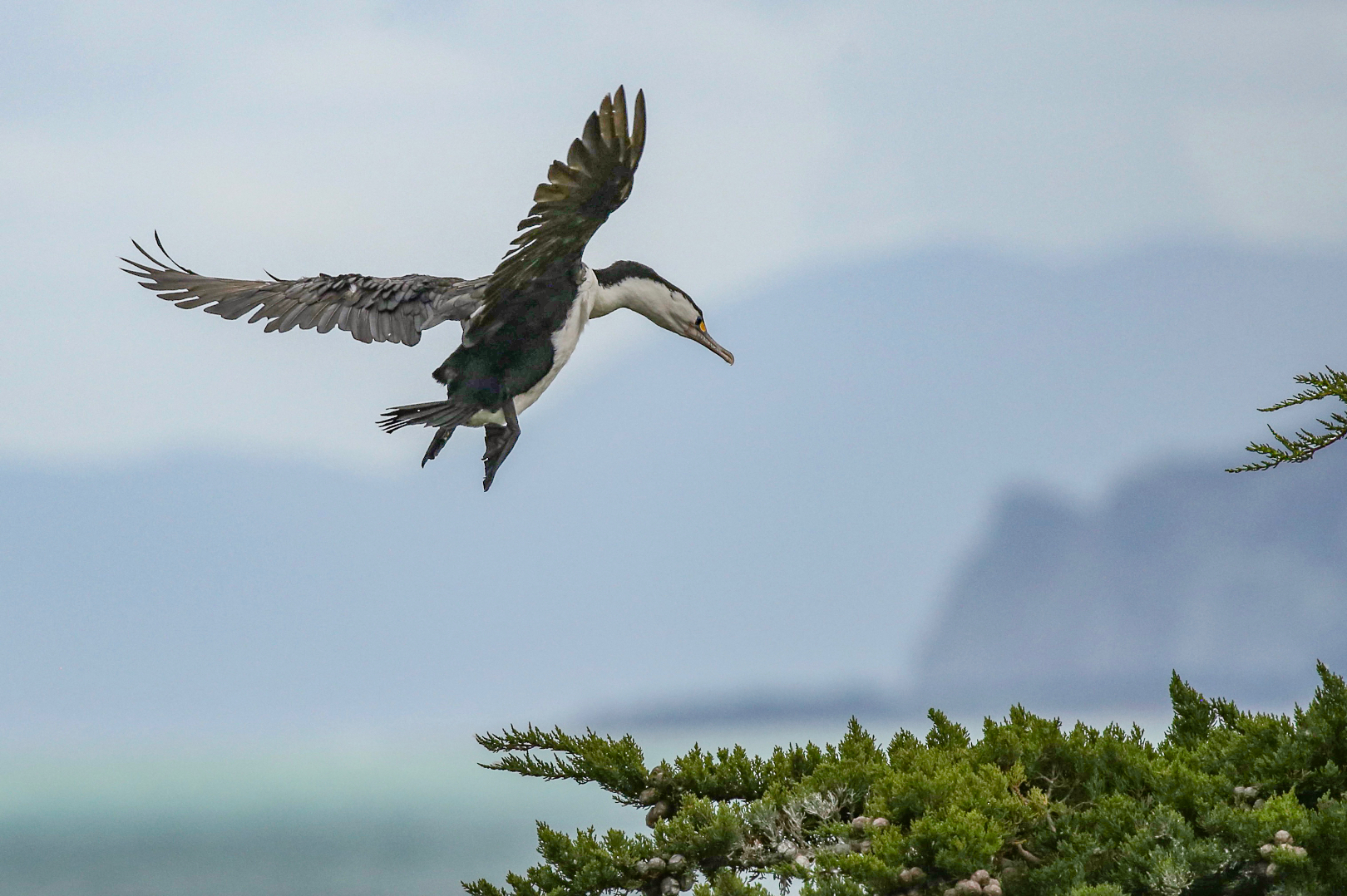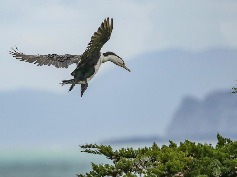 Shag Landing. This is the pied shag, which wouldn't have been very hard for you to find out. And I think that it would have been nice to add that detail. It's an interesting image just suffers a bit for the lighting that it was shot in, and the fact that the bird is somewhat flying away from us, so we're not really getting a good view of the bird from this perspective. But it is sharp, and it looks like it is coming in for a landing in looks like a Macrocarpa of some sort. Maybe that's where it's roosting or nesting.